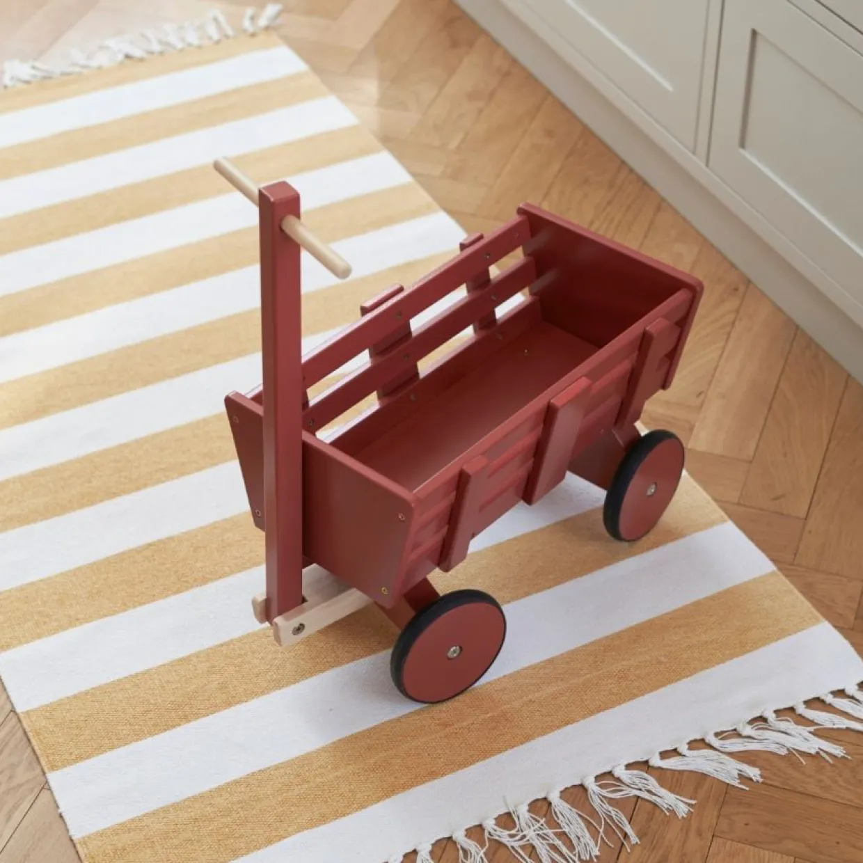 Dockskrinda i Carl Larsson-stil i en fin mörkröd färg. Denna typ av vagn var vanlig vid Carl och Karin Larssons gamla hem. Både idag och när Karin och Carl bodde där med sina barn. Kids Concept ville göra en liknande vagn, men för barnens leksaker och dockor, ett roligt sätt att dra runt din docka när du är 3-6 år. Vagnen är designad för inomhuslek och har gummifälgar på hjulen. Fronten har roterande hjul och kan styras med en träpinne. Om du tar med den utanför för en promenad, se till att skydda den från regn och fukt och förvara den inne. Tillverkad av FSC-certifierat trä.