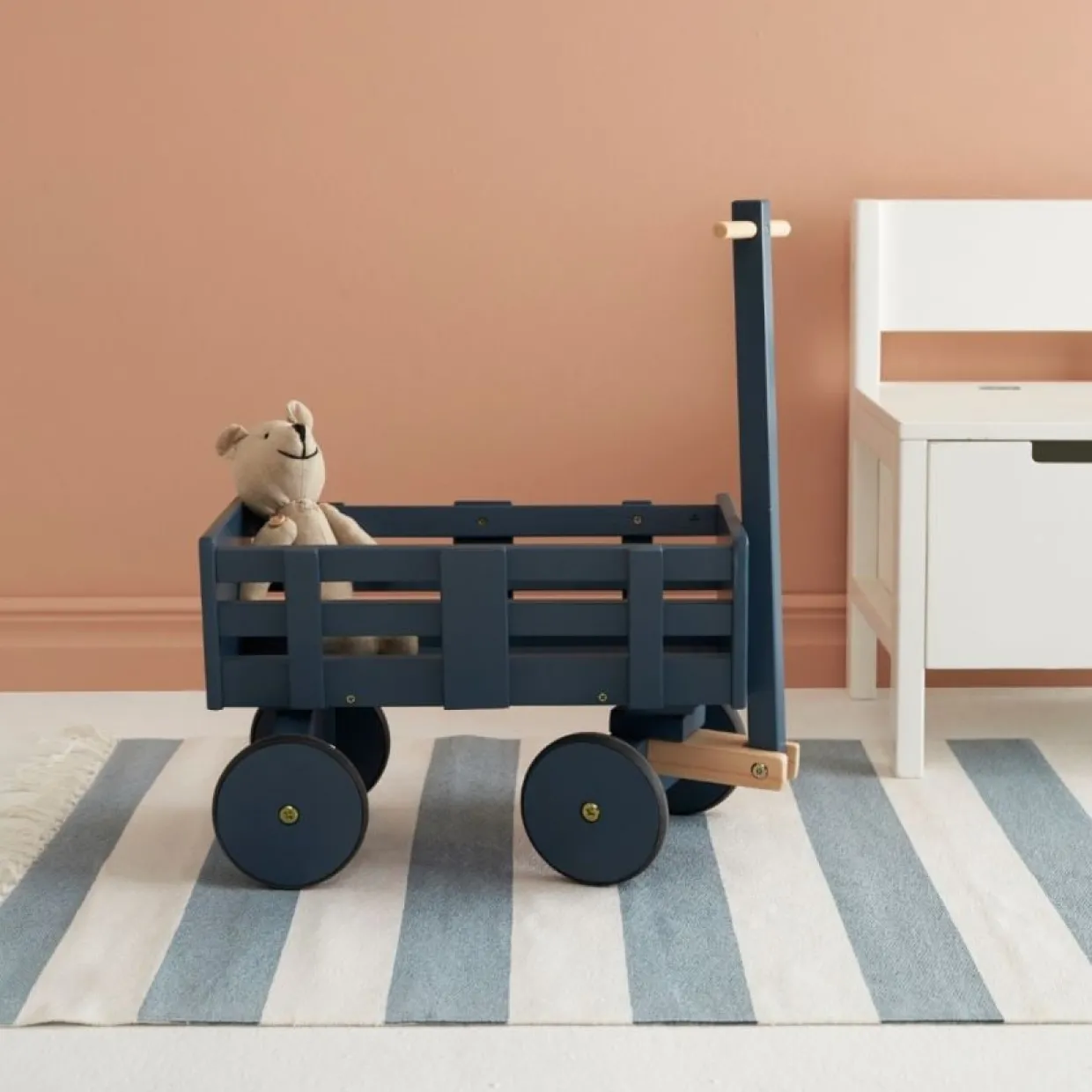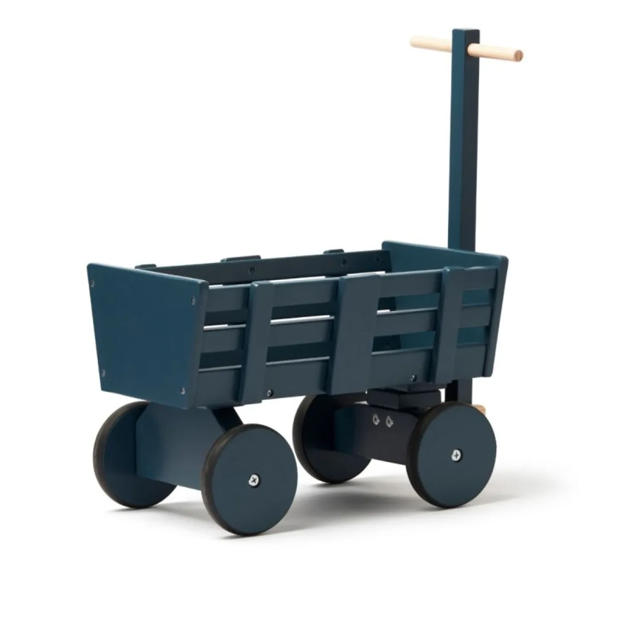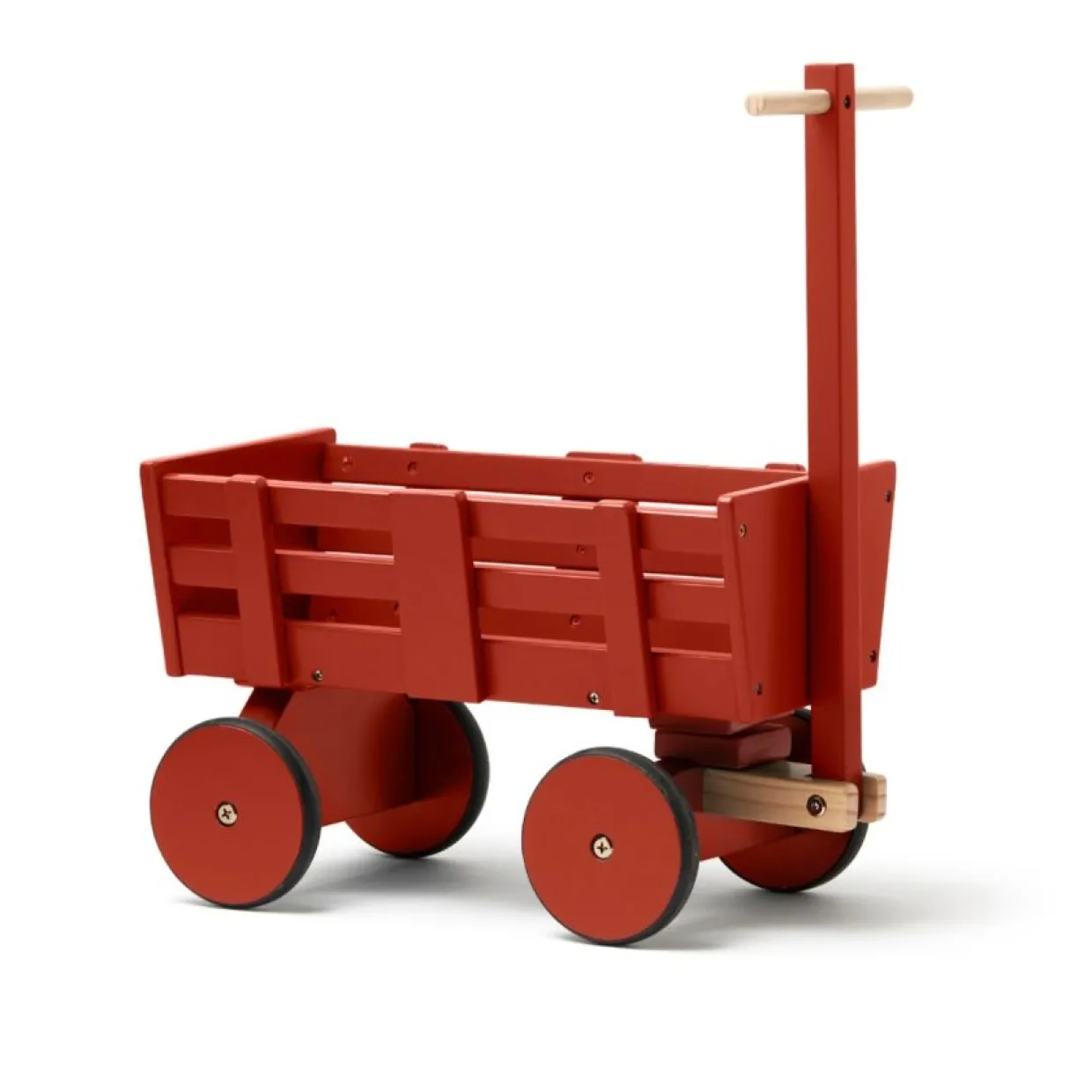Dockskrinda i Carl Larsson-stil i två fina färger. Denna typ av vagn var vanlig vid Carl och Karin Larssons gamla hem. Både idag och när Karin och Carl bodde där med sina barn. Kids Concept ville göra en liknande vagn, men för barnens leksaker och dockor, ett roligt sätt att dra runt din docka när du är 3-6 år. Vagnen är designad för inomhuslek och har gummifälgar på hjulen. Fronten har roterande hjul och kan styras med en träpinne. Om du tar med den utanför för en promenad, se till att skydda den från regn och fukt och förvara den inne. Tillverkad av FSC-certifierat trä.