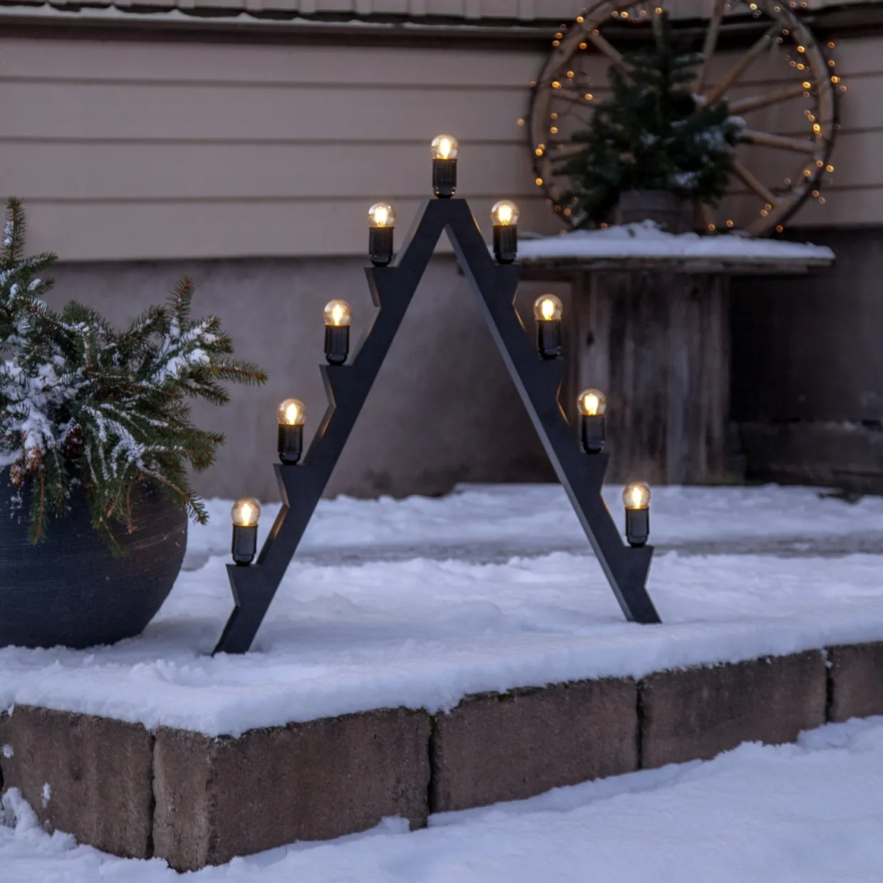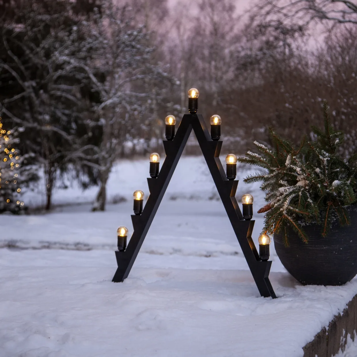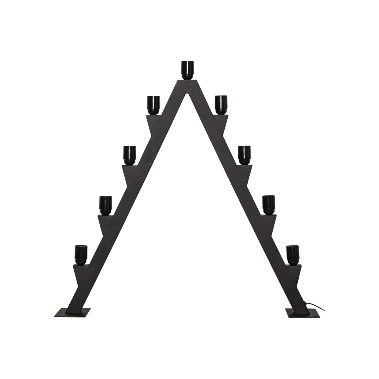 Skapa en stämningsfull jul med en stor, modern adventsljusstake i svart metall. Ljusstaken är anpassad för utomhusbruk, men går självklart lika bra att använda inomhus där du vill sätta extra julkänsla. Den levereras komplett med lampor och har en extra lång kabel samt en transformator med timerfunktion som gör det enkelt att styra belysningen. Tack vare det medföljande markspettet kan du dessutom fästa ljusstaken stadigt i marken.