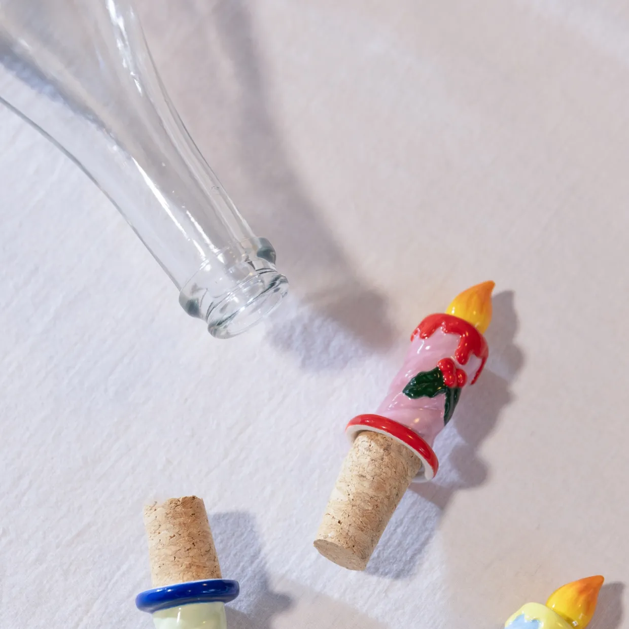 Ge dukningen en lekfull detalj med denna flaskpropp med ljushållare. De handmålade keramiska detaljerna ger varje produkt sin egen charm, medan den naturliga korkproppen håller flaskan förseglad med stil. En liten men festlig gåva, eller en rolig detalj till ditt eget kök.
