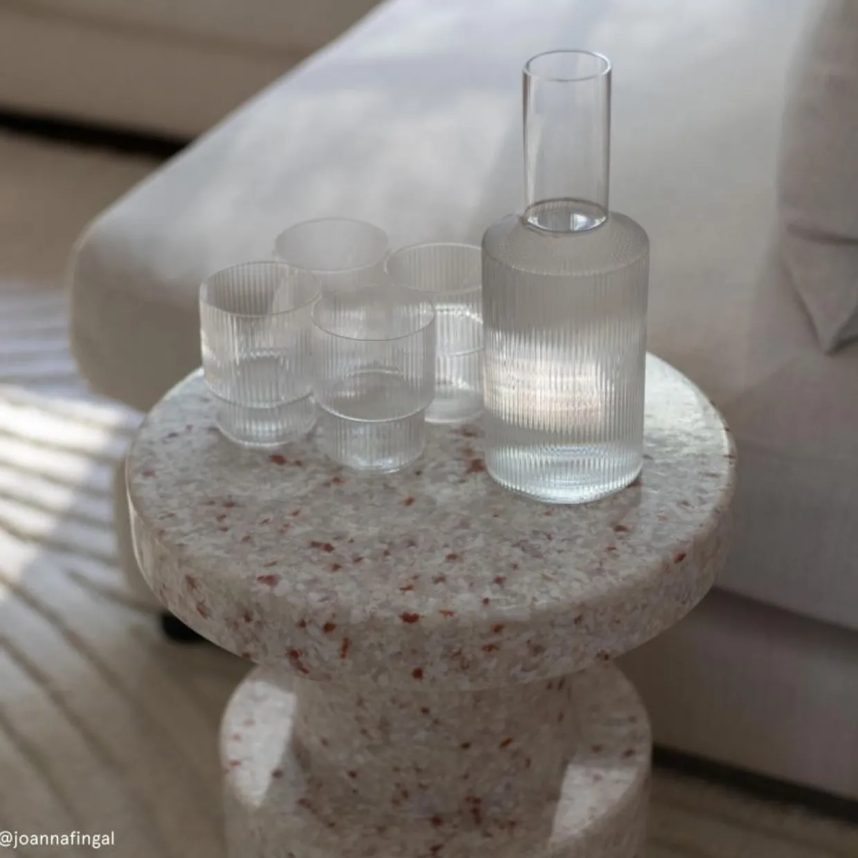 Glasen ingår i kollektion Ripple från Ferm Living som består av två storlekar på dricksglas, champagneglas, vinglas och karaff.
