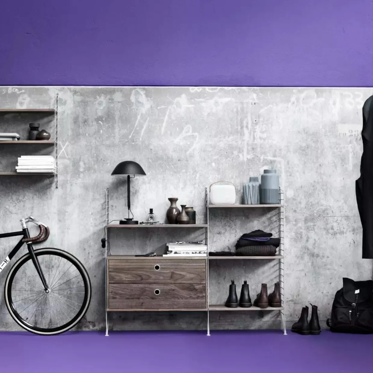 Golvgavlar finns i tre höjder, 85 cm, 115 cm, 200 cm, samt ett djup, 30 cm. Gavlarna är basen för att bygga din stringhylla. Därefter kan du addera produkter från String System förutsatt att de har 30 cm djup. Välj mellan en rad olika produkter så som hyllplan, skåp, lådhurtsar och tidskriftshyllor. Golvgaveln vilar mot golvet med sin fot vilket gör den väldigt stabil men samtidigt ger en lätt och luftig känsla. För att göra din hylla ännu mer funktionell och unik kan du komplettera med organizers, knivblock eller en tidskriftssamlare som hängs på gaveln. Golvgavlarna säljs i både 1-pack och 2-pack.