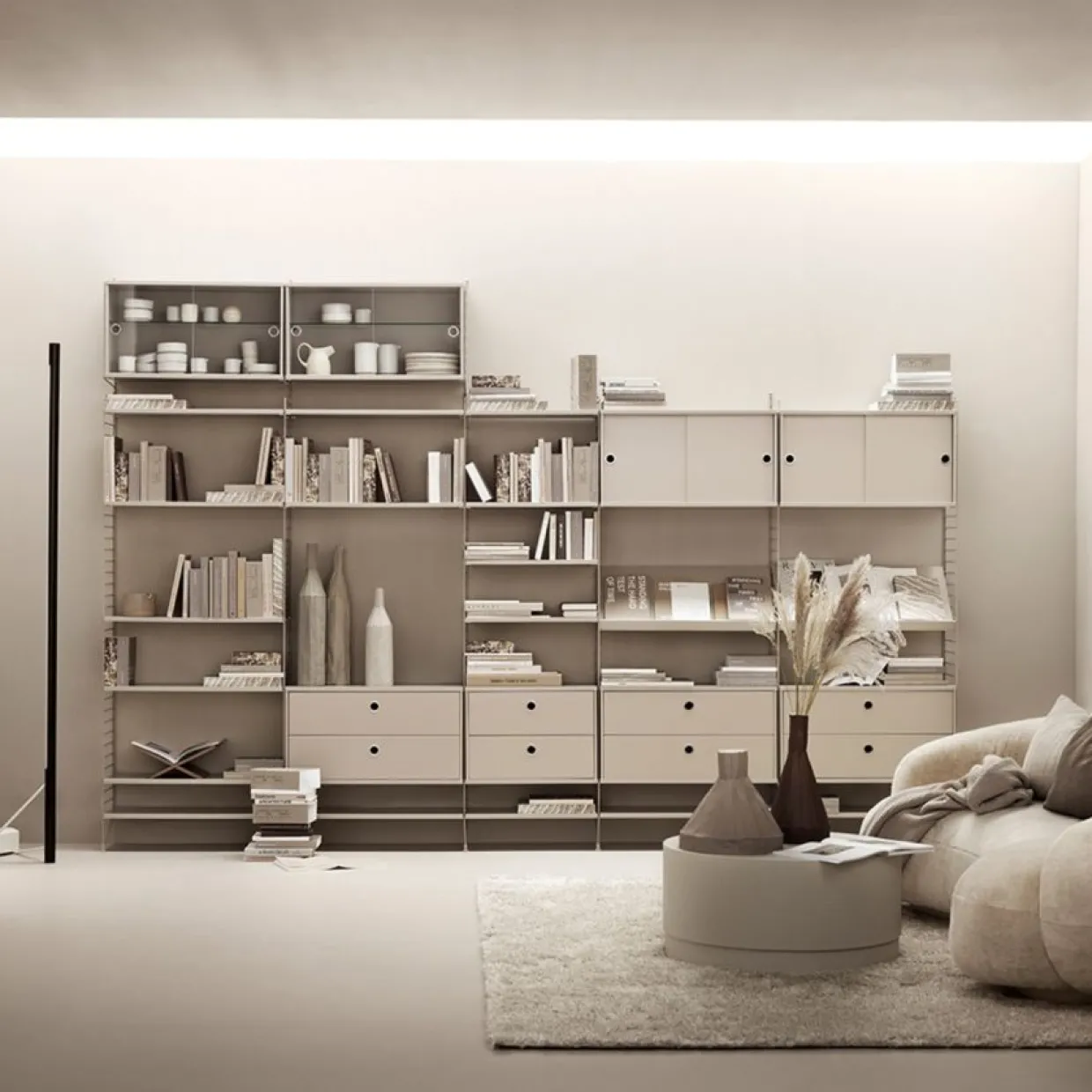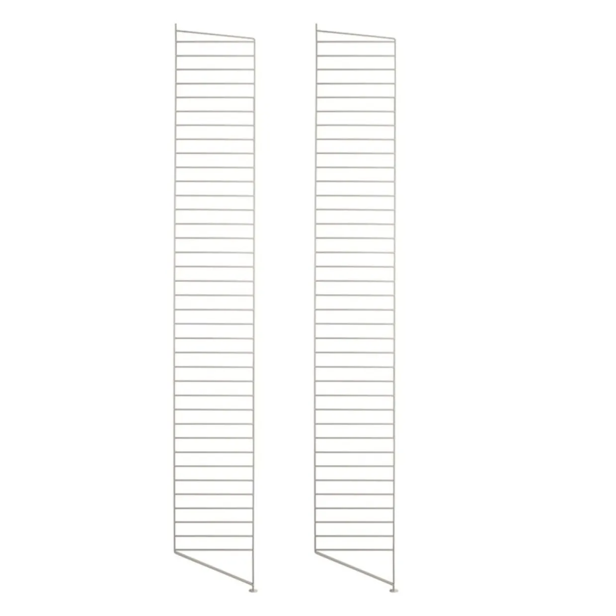 Golvgavlar finns i tre höjder, 85 cm, 115 cm, 200 cm, samt ett djup, 30 cm. Gavlarna är basen för att bygga din stringhylla. Därefter kan du addera produkter från String System förutsatt att de har 30 cm djup. Välj mellan en rad olika produkter så som hyllplan, skåp, lådhurtsar och tidskriftshyllor. Golvgaveln vilar mot golvet med sin fot vilket gör den väldigt stabil men samtidigt ger en lätt och luftig känsla. För att göra din hylla ännu mer funktionell och unik kan du komplettera med organizers, knivblock eller en tidskriftssamlare som hängs på gaveln. Golvgavlarna säljs i både 1-pack och 2-pack.