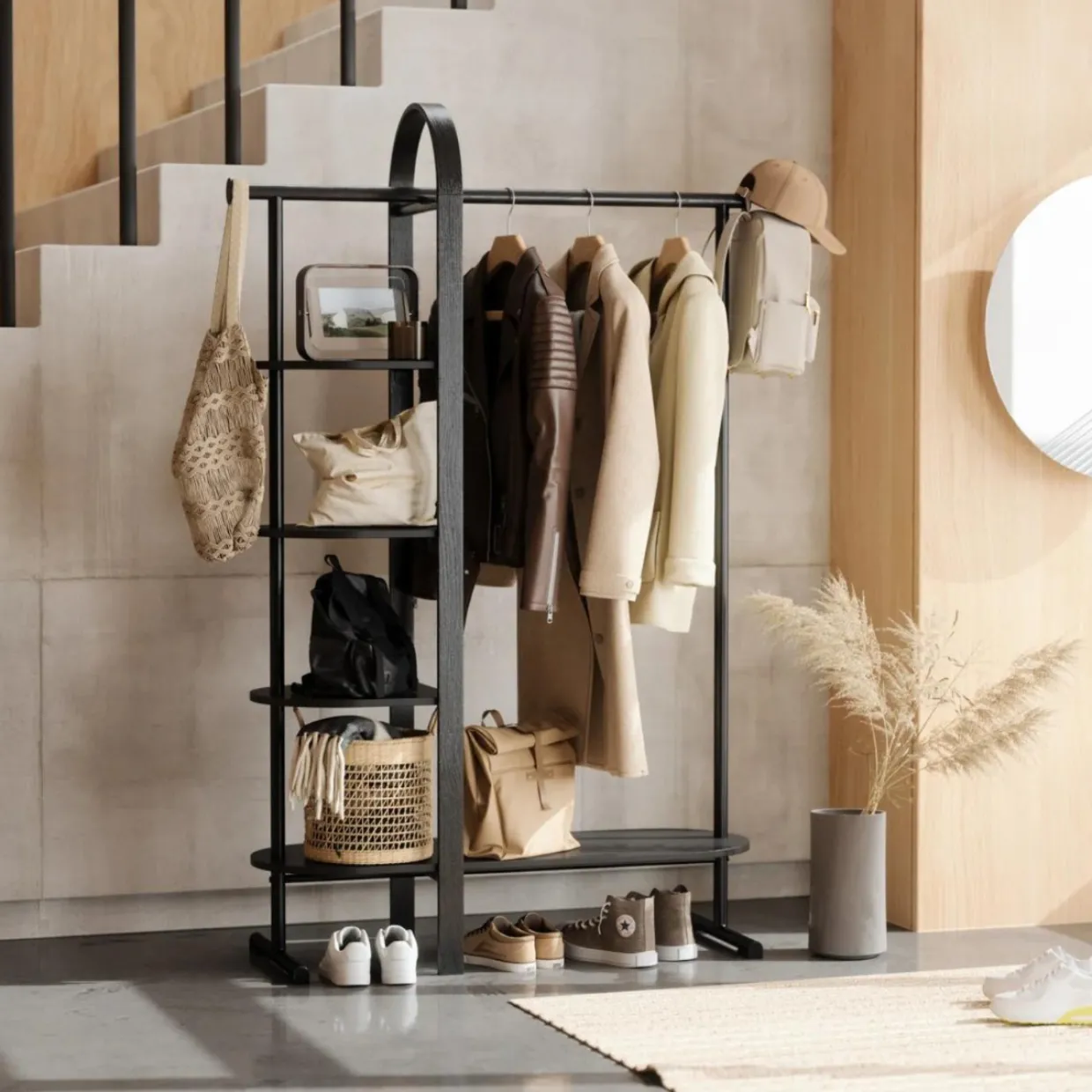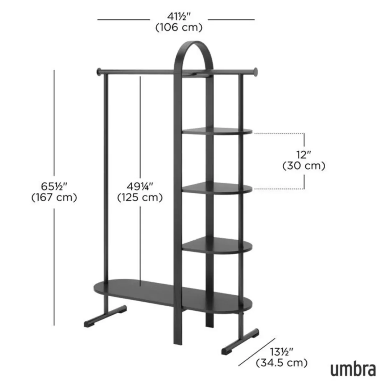 En snygg klädställning som sparar plats samtidigt som den ger en dekorativ touch, Bellwood Hallförvaring från UMBRA blandar mjuka kurvor med stiliga trädetaljer. Denna moderna och mångsidiga förvaring är perfekt för att organisera och visa upp dina kläder, skor, väskor och andra accessoarer. Med fyra platsbesparande hyllor och integrerad stång i stål kan Bellwood Hallförvaring användas i ditt sovrum, tvättstuga, garderob, entré och mer för att förvara och organisera dina tillhörigheter. Klädställningen är enkel att montera och levereras med all nödvändig hårdvara och instruktioner. Max vikt kapacitet är 55 kg totalt.