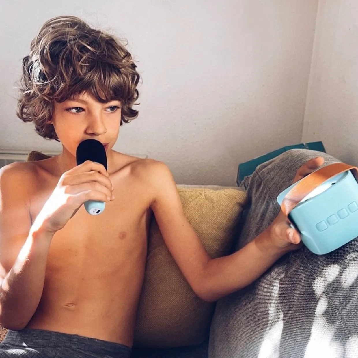 Här är ett fantastiskt trådlöst karaoke set för barn som består av en bluetooth högtalare och en trådlös mikrofon i blått. Det är ett perfekt sätt att skapa en rolig och underhållande upplevelse för både barn och vuxna där ni kan sjunga med i era favoritlåtar, uttrycka er musikaliskt och ha riktigt kul. Högtalaren är utrustad med ett praktiskt handtag, som gör den enkel att bära med sig, samt en minneskortsplats för ett TF/Micro SD kort på upp till 32 GB (ingår ej). Den kompakta bluetooth högtalaren har ett frekvensomfång mellan 20 och 20 000 Hz, vilket ger en bra ljudkvalitet. Både mikrofonen och högtalaren har praktiska knappar som du kan styra musiken med, samt en knapp för att lägga till en eko-effekt på ljudet från mikrofonen. Att ladda ner dina favoritlåtar från streamingtjänster som till exempel Spotify är enkelt och flera tjänster tillhandahåller även låttexten, så du kan koppla din smartphone eller annan enhet till bluetooth högtalaren och snabbt komma igång. Detta set är utrustat med Bluetooth 5.0 som har en räckvidd mellan enheterna på ca 10 meter. Både högtalaren och mikrofonen har laddbara batterier som enkelt laddas med hjälp av den medföljande USB-C sladden.