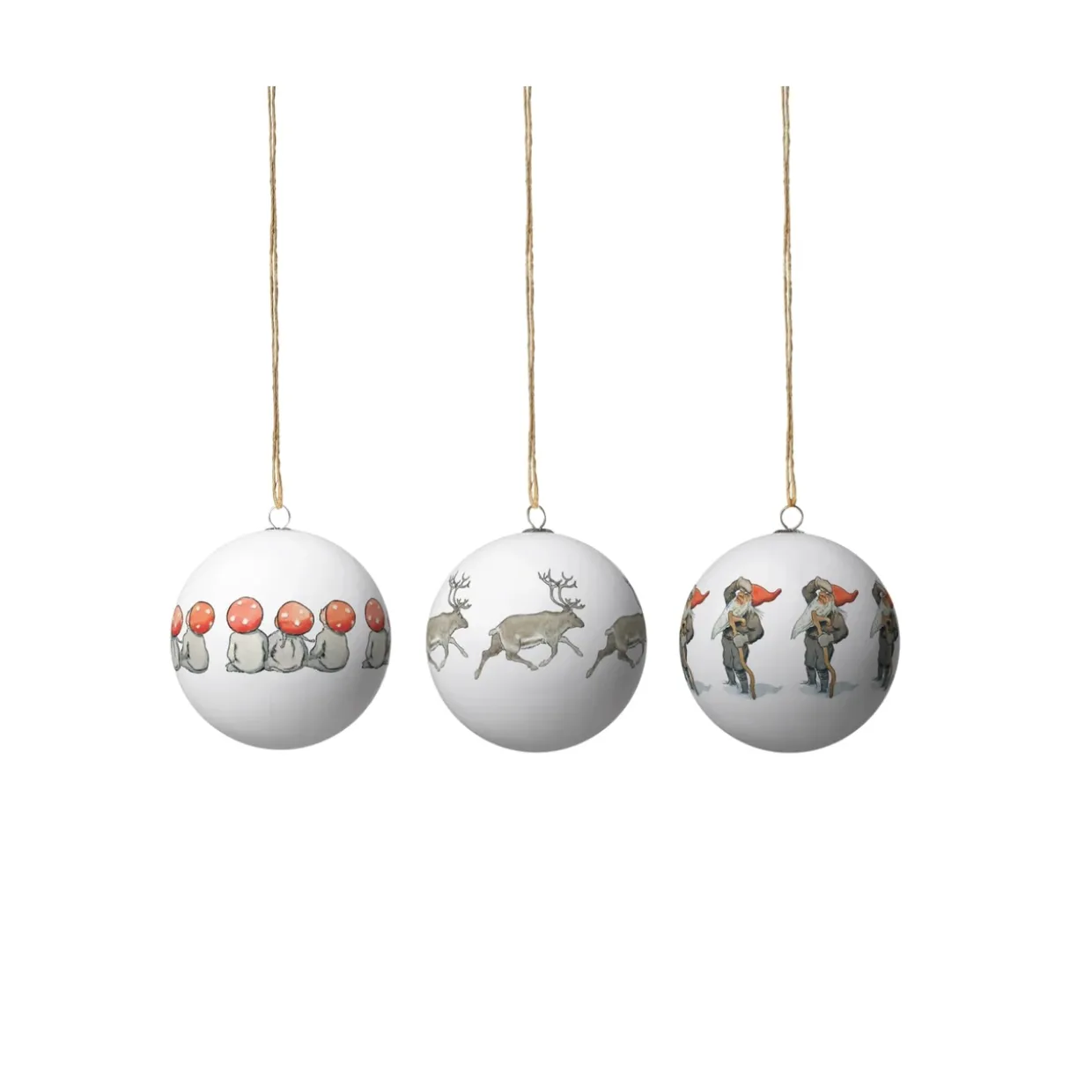 Julgranspynt: Lackerat papperdecoupage, metallkrok och textilsnöre.