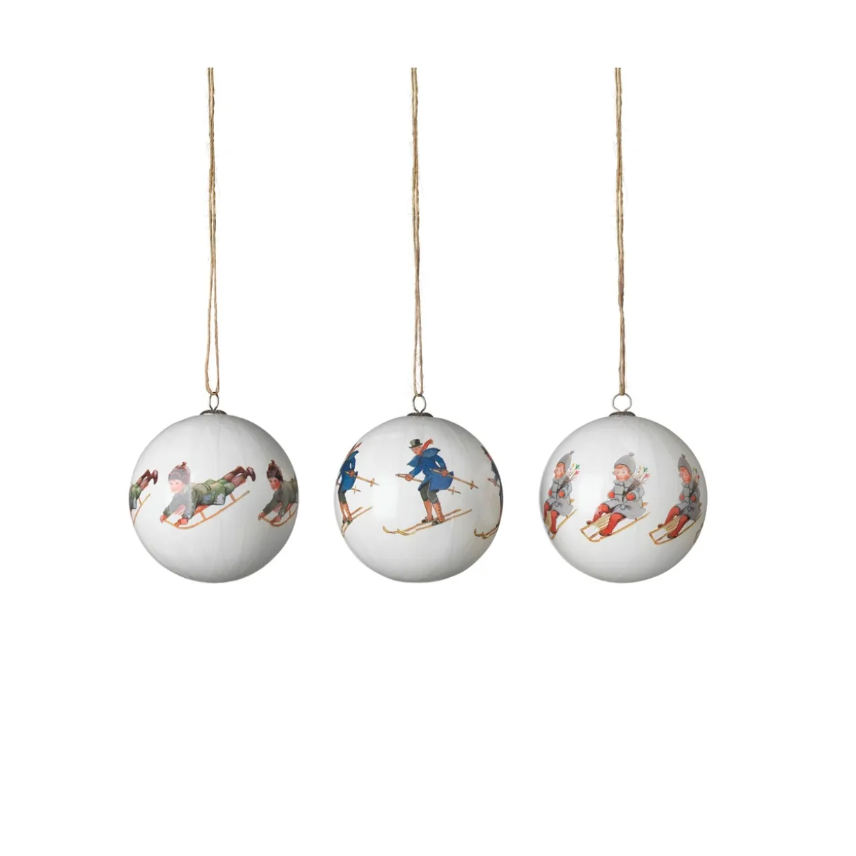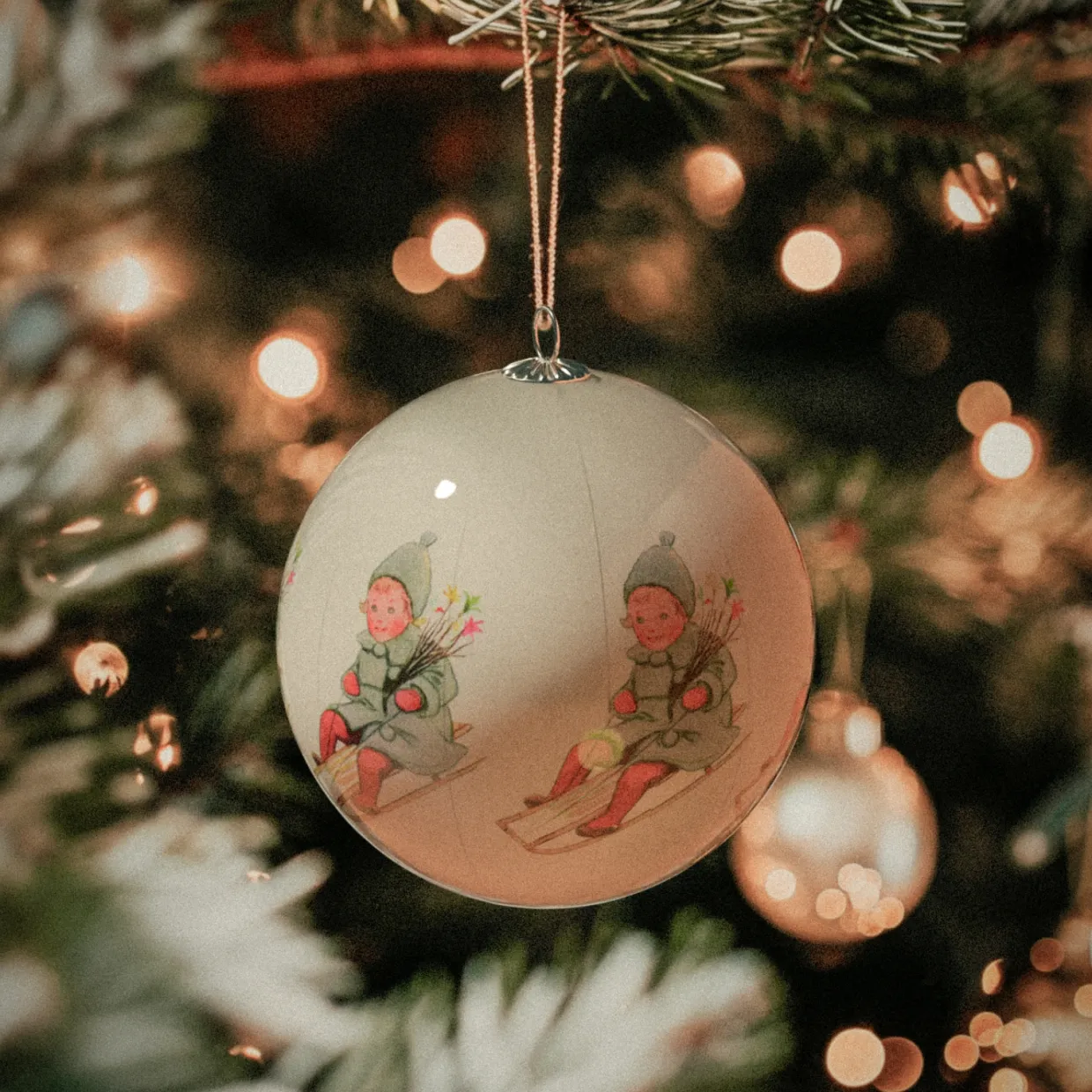 Julgranspynt: Lackerat papperdecoupage, metallkrok och textilsnöre.