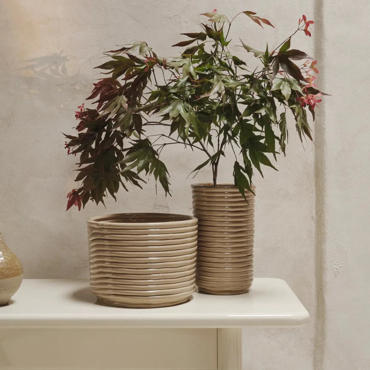Corduroy-krukan är noggrant tillverkad av glaserad keramik och ger ditt hem en autentisk känsla av hantverk. Krukan är formad för hand genom att en lång sträng av lera försiktigt rullas till en cylinder.