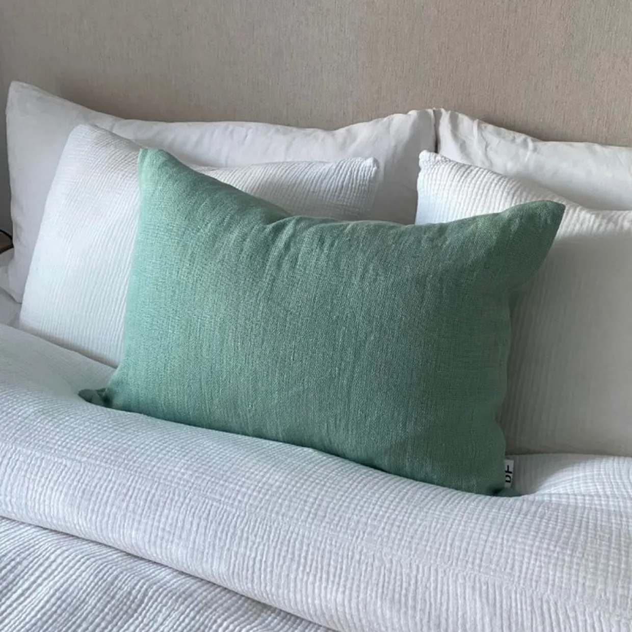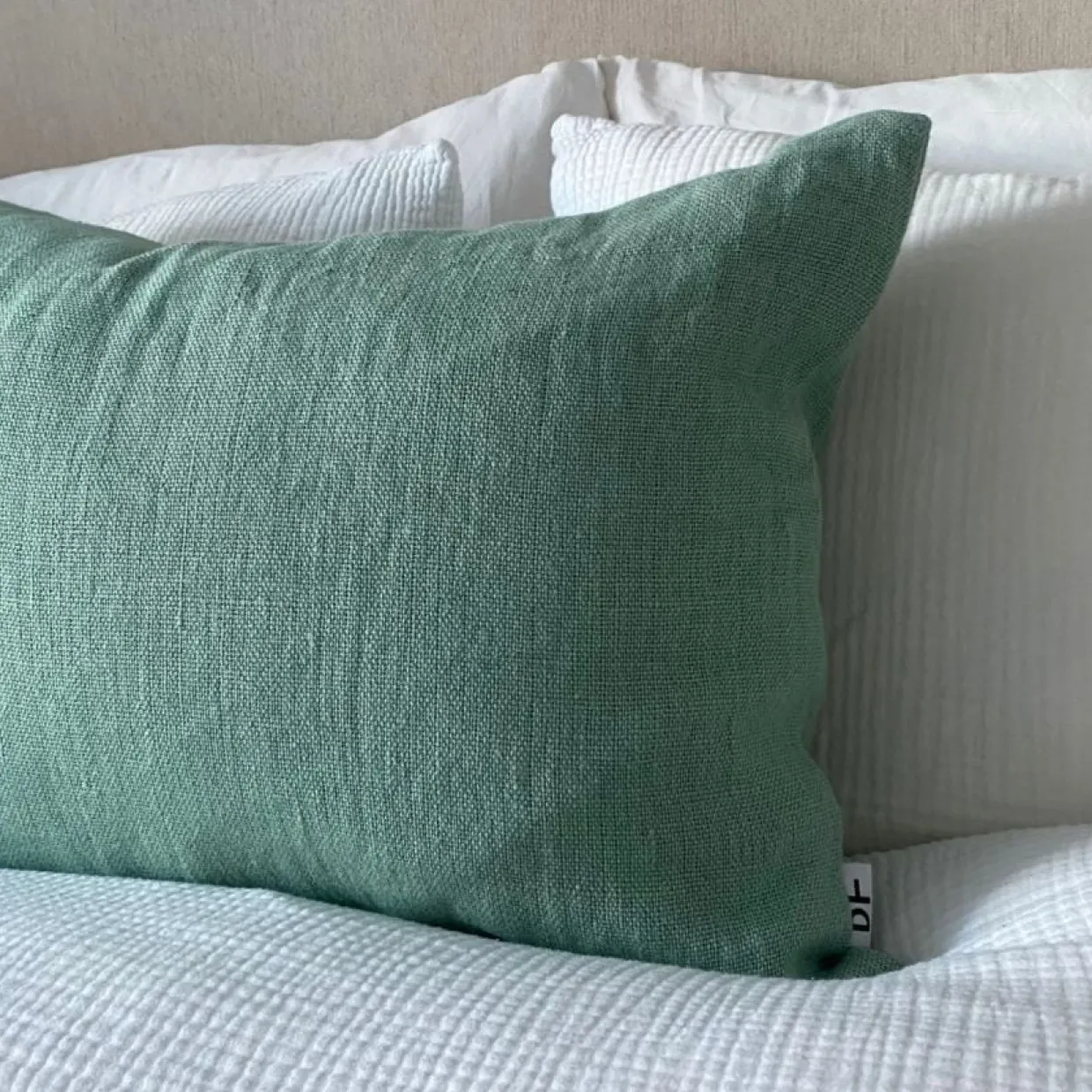 Kuddfodral i 100% linne i färgen grön. En tidlös, enfärgad design som passar i de flesta hem och kan följa med under flera år. Den grova linnekvaliteten har en väv som lyfter fram linets vackra lyster och ger en mjuk och härlig känsla. Kuddfodralet är fodrat för ännu bättre hållbarhet. Finns i olika färger och storlekar som är fina att blanda eller att matcha med våra mönstrade kuddar.