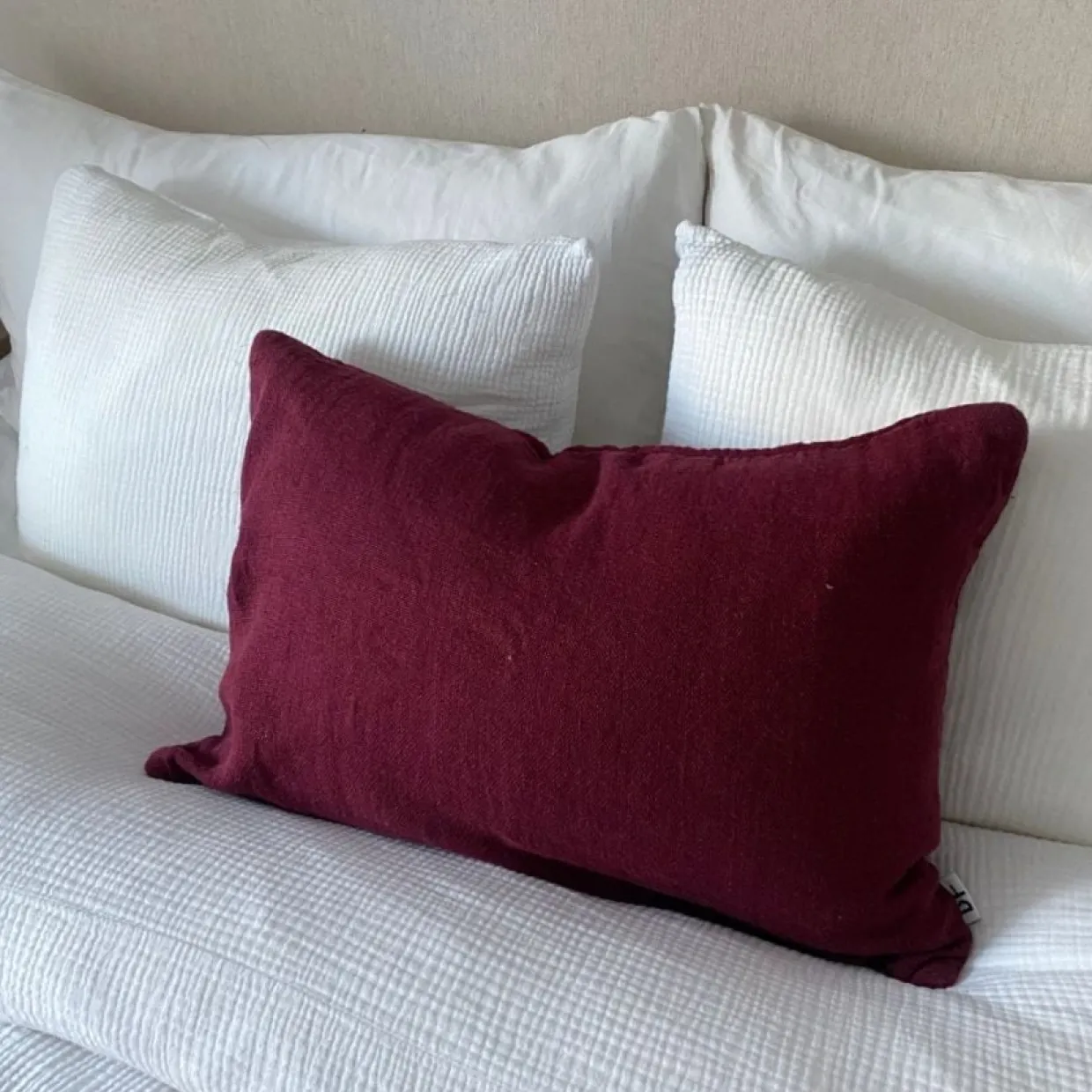 Kuddfodral i 100% linne i färgen vinröd. En tidlös, enfärgad design som passar i de flesta hem och kan följa med under flera år. Den grova linnekvaliteten har en väv som lyfter fram linets vackra lyster och ger en mjuk och härlig känsla. Kuddfodralet är fodrat för ännu bättre hållbarhet. Finns i olika färger och storlekar som är fina att blanda eller att matcha med våra mönstrade kuddar.