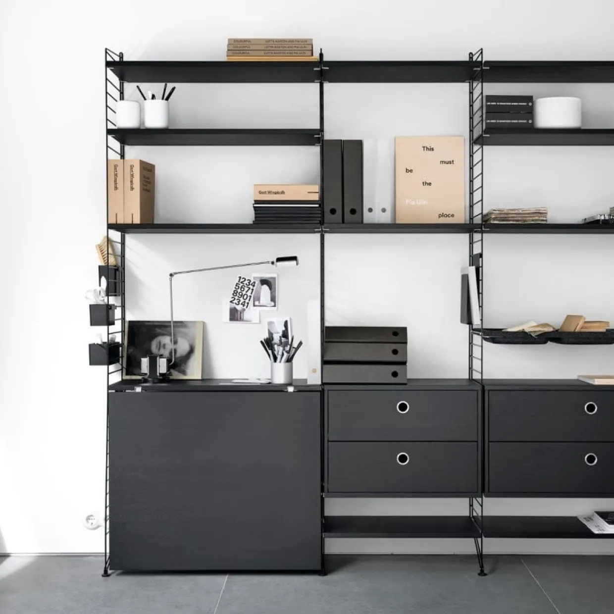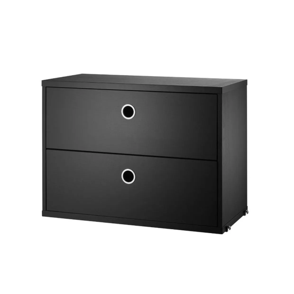 Skåp i lackad MDF med 2 lådor och handtag i rostfritt stål som passar på String gavlar och som kan enkelt integreras i String hyllsystemet i några få steg. Perfekt till vardagsrummet, hallen eller i sovrummet. Här får du goda förvaringsmöjligheter, oavsett om du bor litet eller stort.