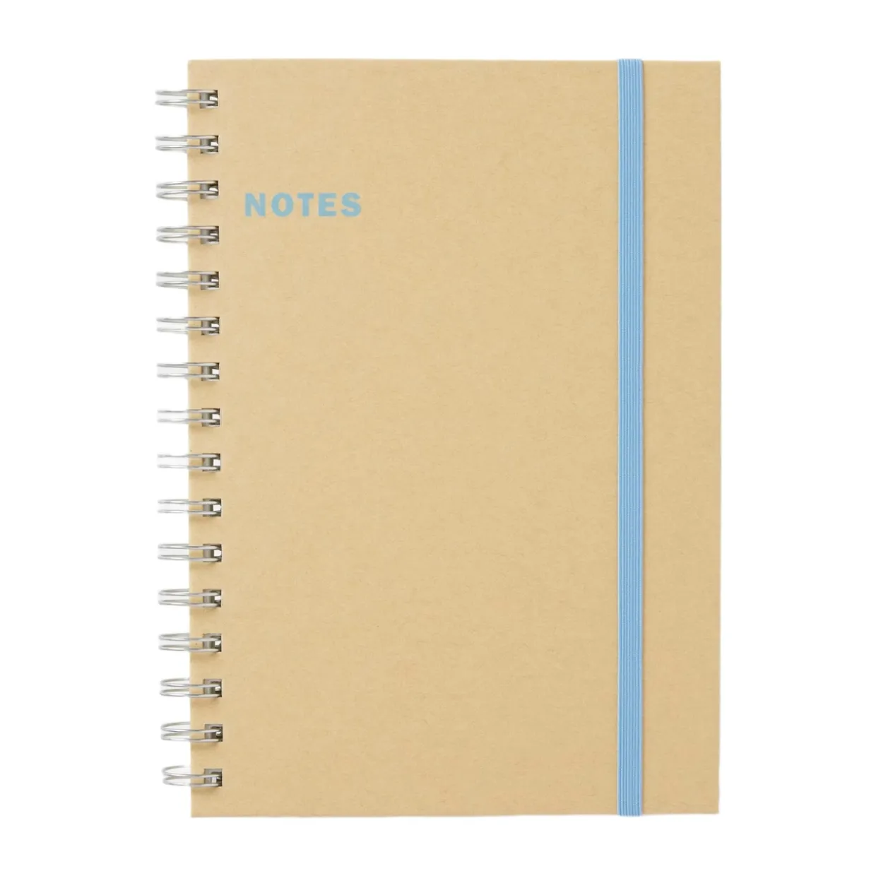 Linjerad skrivbok med färgmatchad elastisk snodd, spiralrygg och enfärgade pärmar i kartong.