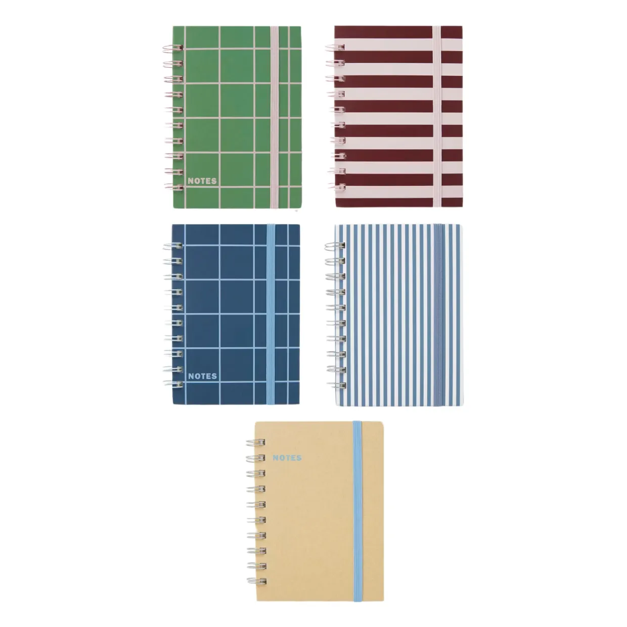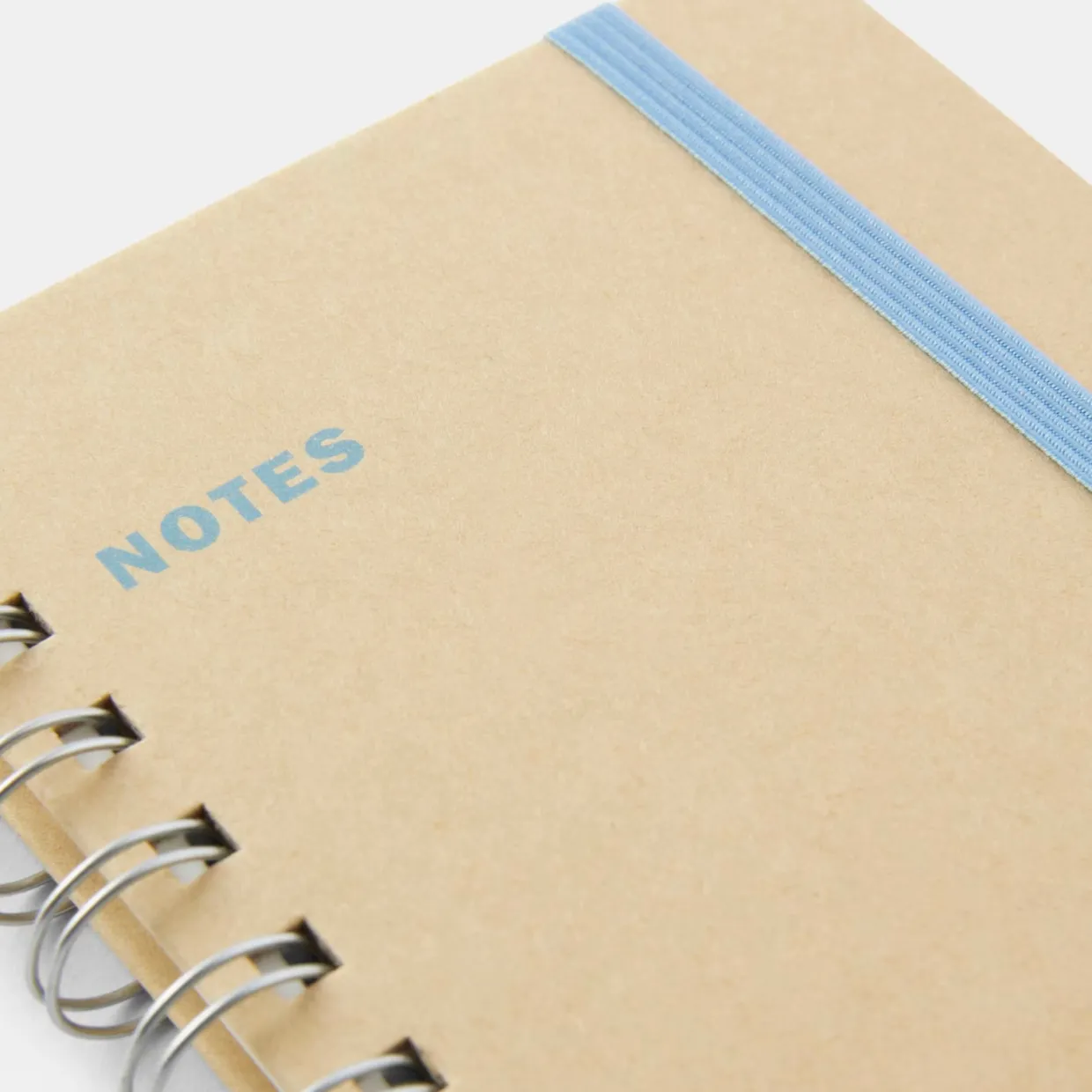 Linjerad skrivbok med färgmatchad elastisk snodd, spiralrygg och enfärgade pärmar i kartong.