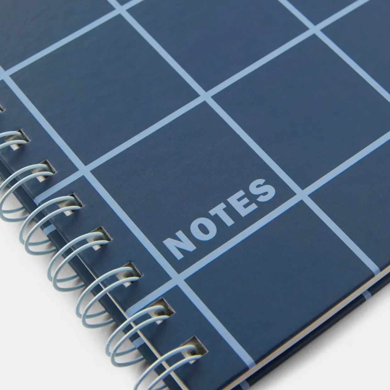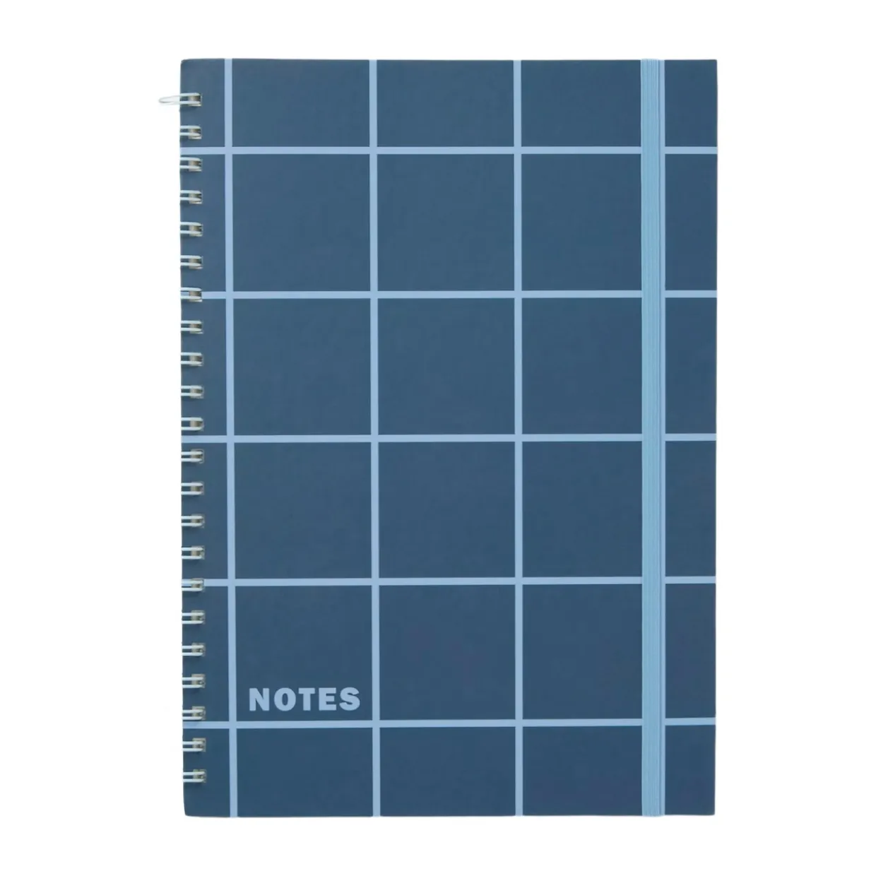 Linjerad skrivbok med färgmatchad elastisk snodd, spiralrygg och rutiga pärmar i kartong.