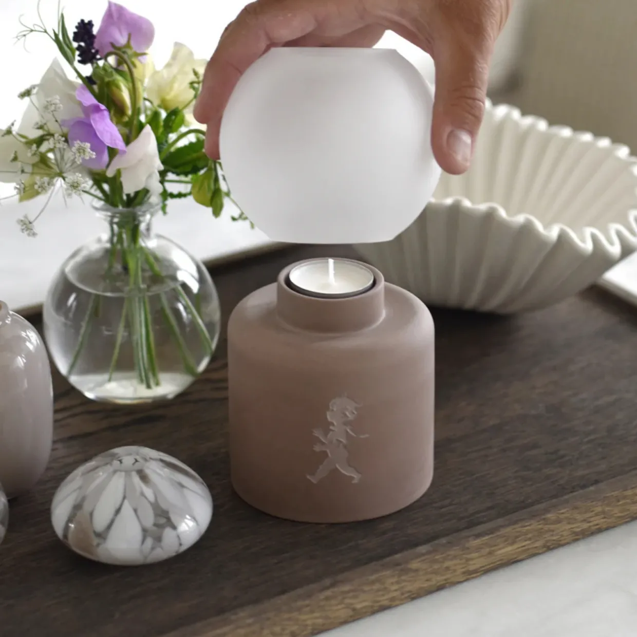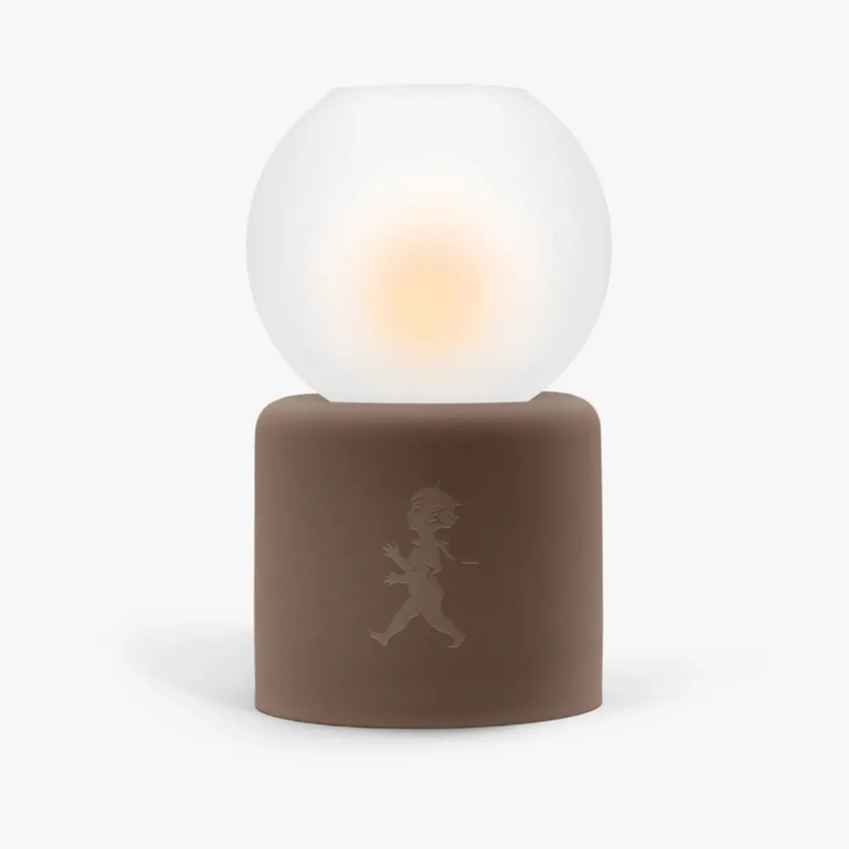 För att skapa en illusion av en lampa utan sladdar har de valt ett frostat glas som avger ett varmt sken, utan att avslöja det levande ljuset.