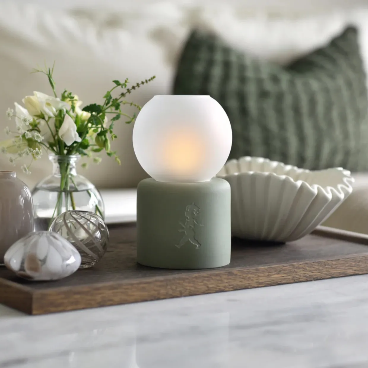 För att skapa en illusion av en lampa utan sladdar har de valt ett frostat glas som avger ett varmt sken, utan att avslöja det levande ljuset.