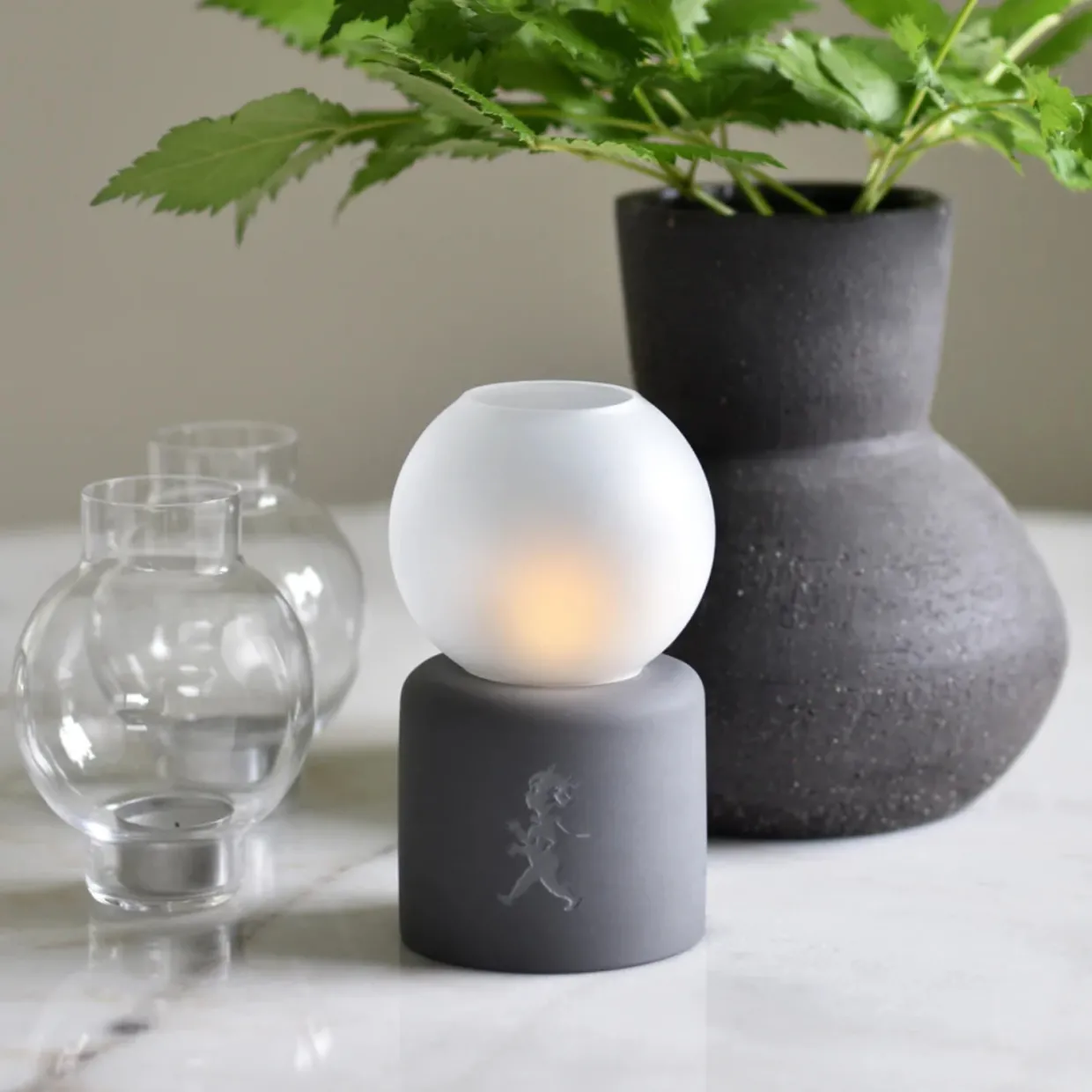 För att skapa en illusion av en lampa utan sladdar har de valt ett frostat glas som avger ett varmt sken, utan att avslöja det levande ljuset.