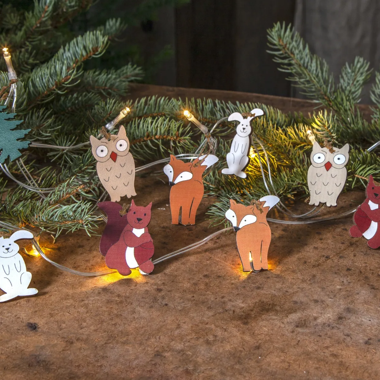 Skapa en varm och lekfull stämning i hemmet med denna ljusslinga för inomhusbruk. Slingan är dekorerad med 10 träfigurer i vackra färger, fastknutna med hampasnöre för en naturlig och charmig känsla.