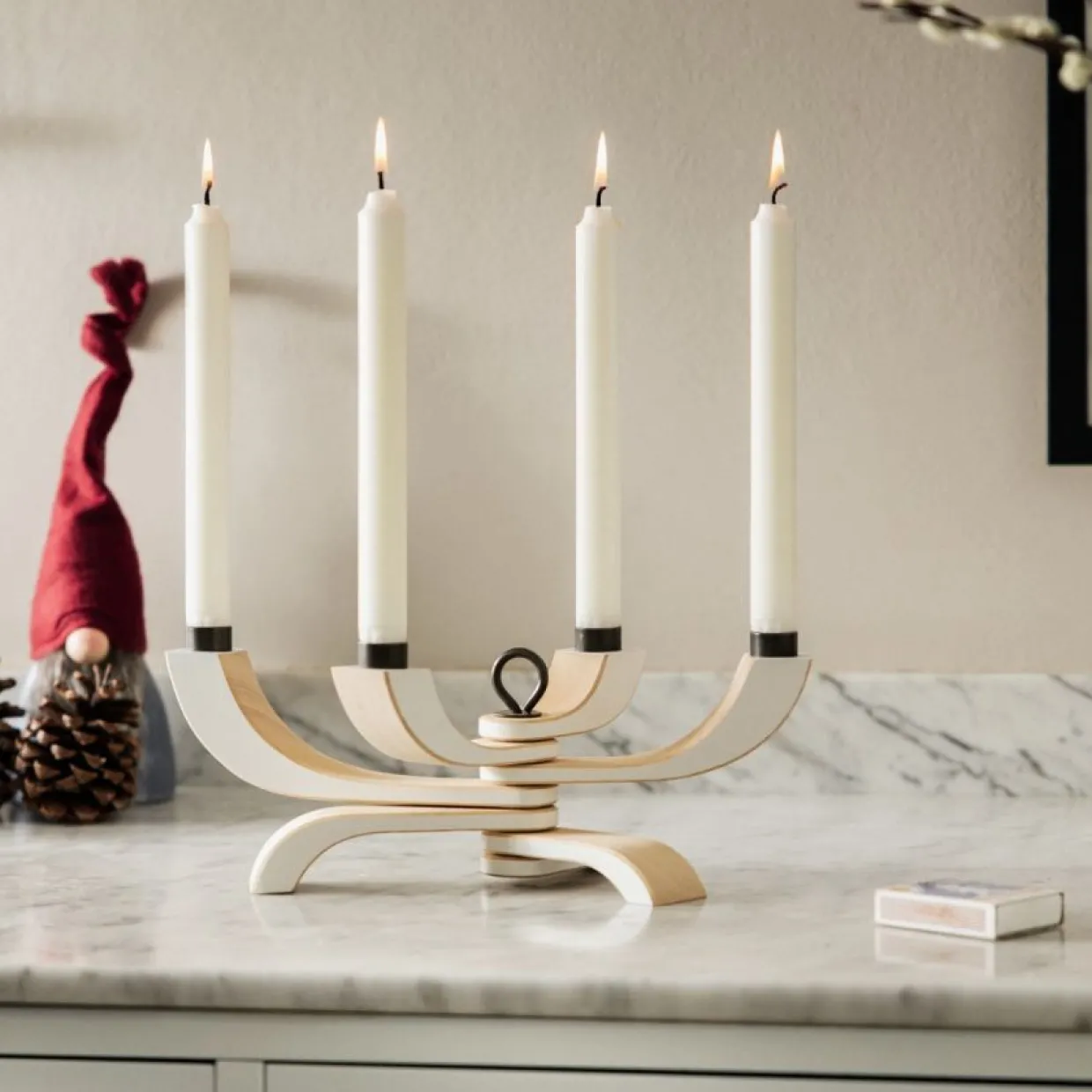 4-armad ljusstake där du själv bestämmer formen. Använd den fullt utfälld, delvis ihopfälld eller helt ihopfälld! Vrid sedan om skruven i mitten. Formgiven av Jonas Grundell för Design House Stockholm. Finns även som sjuarmad ljusstake.