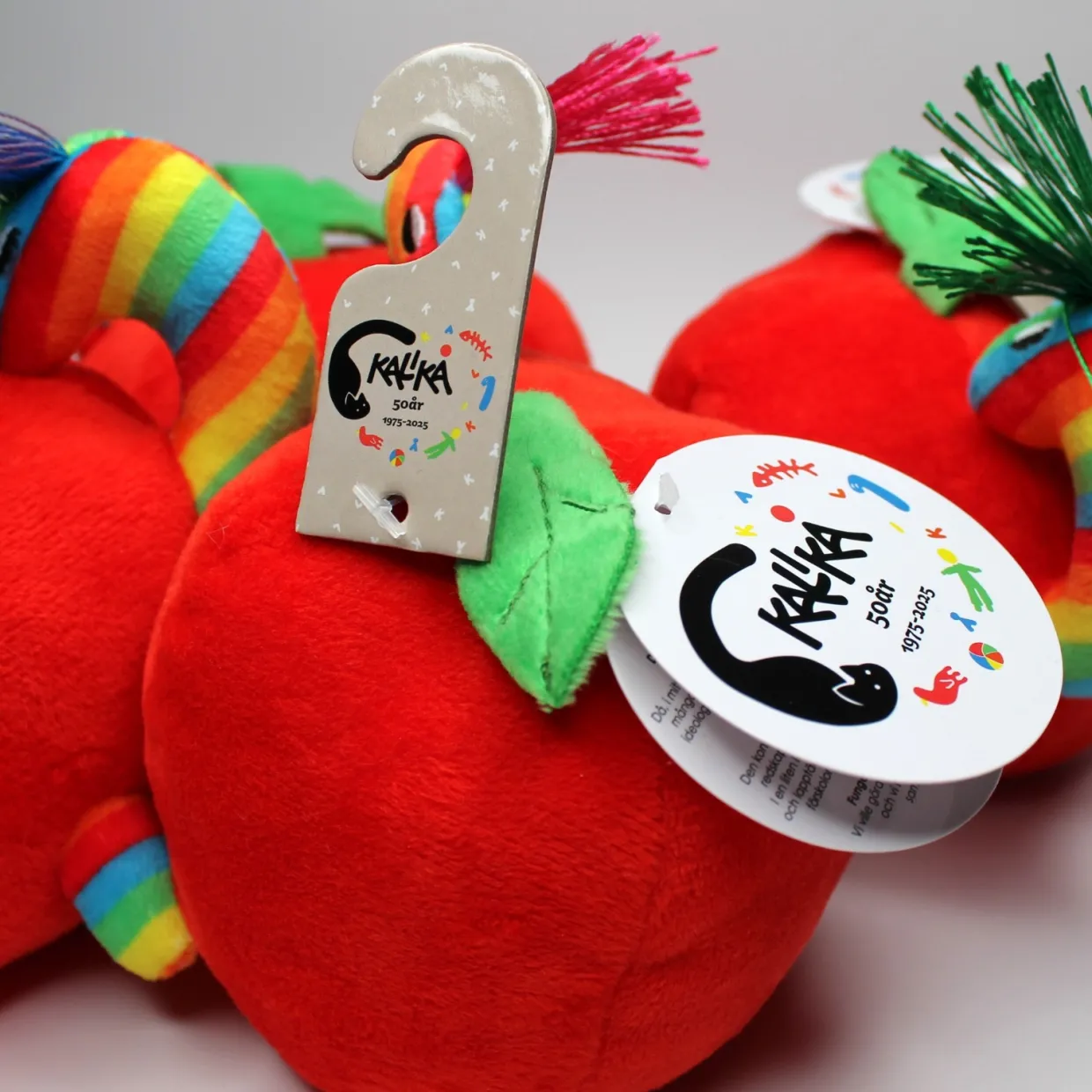 Kalikå Mask i Äpple. 2025 firar Kalikå 50 år som leksakstillverkare. Klassiker ”Maskskallran” i en uppdaterad version får var med och fira detta jubileum! Greppvänligt och färgglatt äpple med bjällra, för den allra minsta handen.