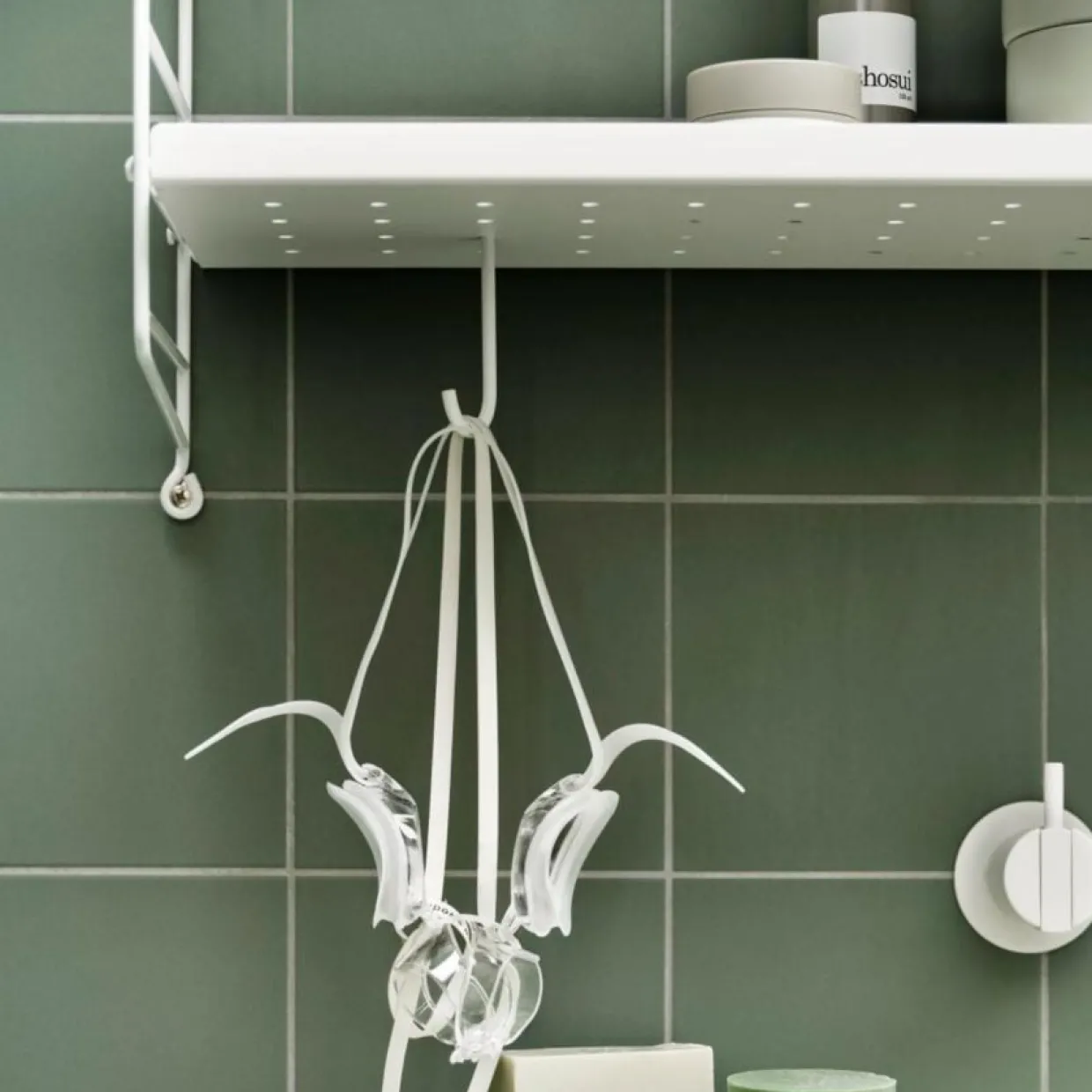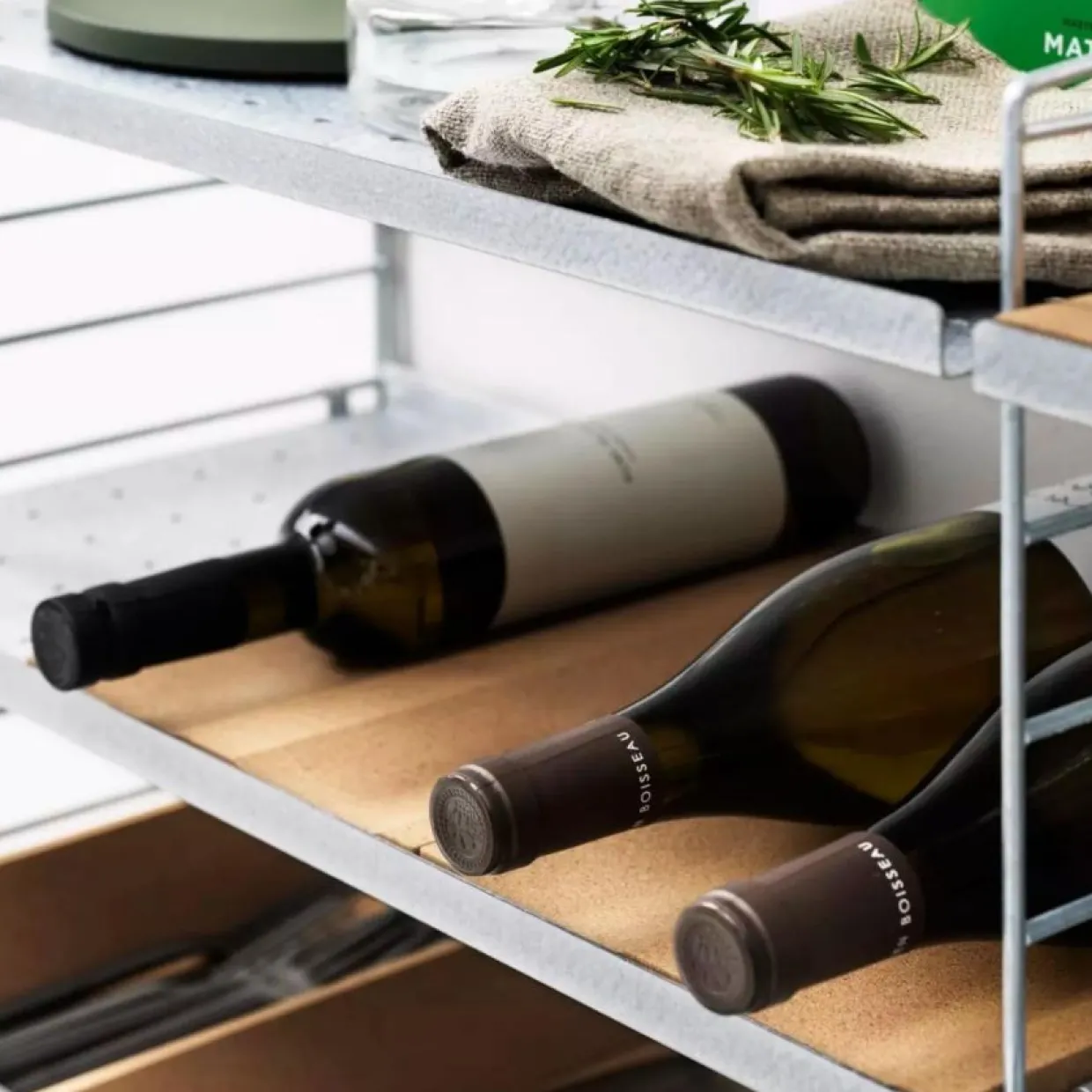 Robust Stringhyllplan i strukturlackad perforerad metall, perfekt till köket eller hallen. Formgiven av Anna von Schewen & Björn Dahlström för String Furniture.