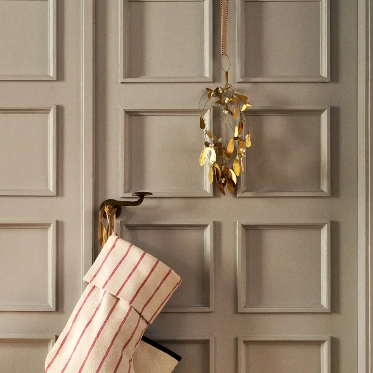 Hängande mistel i guldfärgad metall, fin att hänga över en dörr eller i ett fönster.
