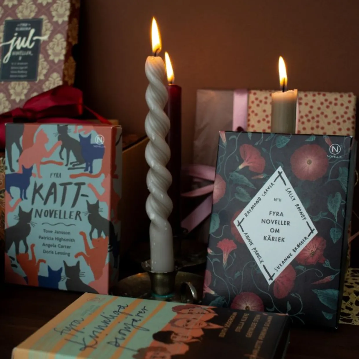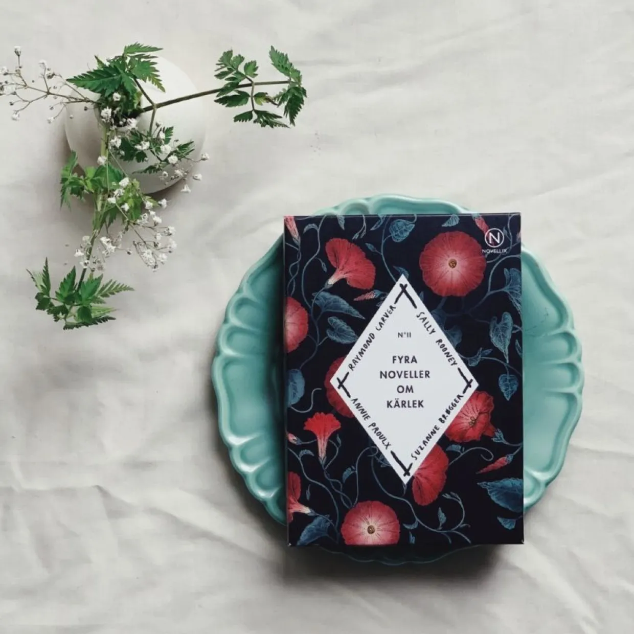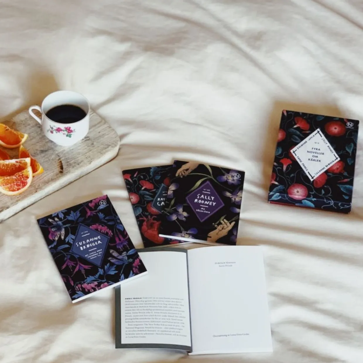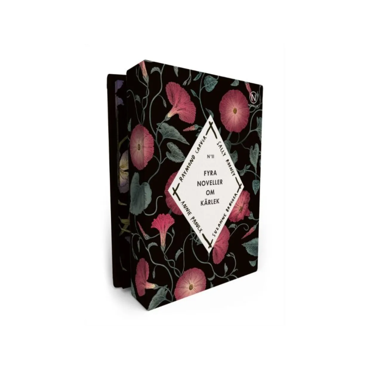 Det här är en ask med berättelser om kärleken: den villkorslösa, den omöjliga, den våldsamma, den utbytbara. Den ständiga. Fyra noveller, skrivna av fyra stora författare: samtida stjärnskottet Sally Rooney, den amerikanske novellmästaren Raymond Carver, feministikonen Suzanne Brøgger och så den flerfaldigt prisbelönade Annie Proulx, vars novell Brokeback Mountain ligger till grund för Ang Lees storfilm från 2005.