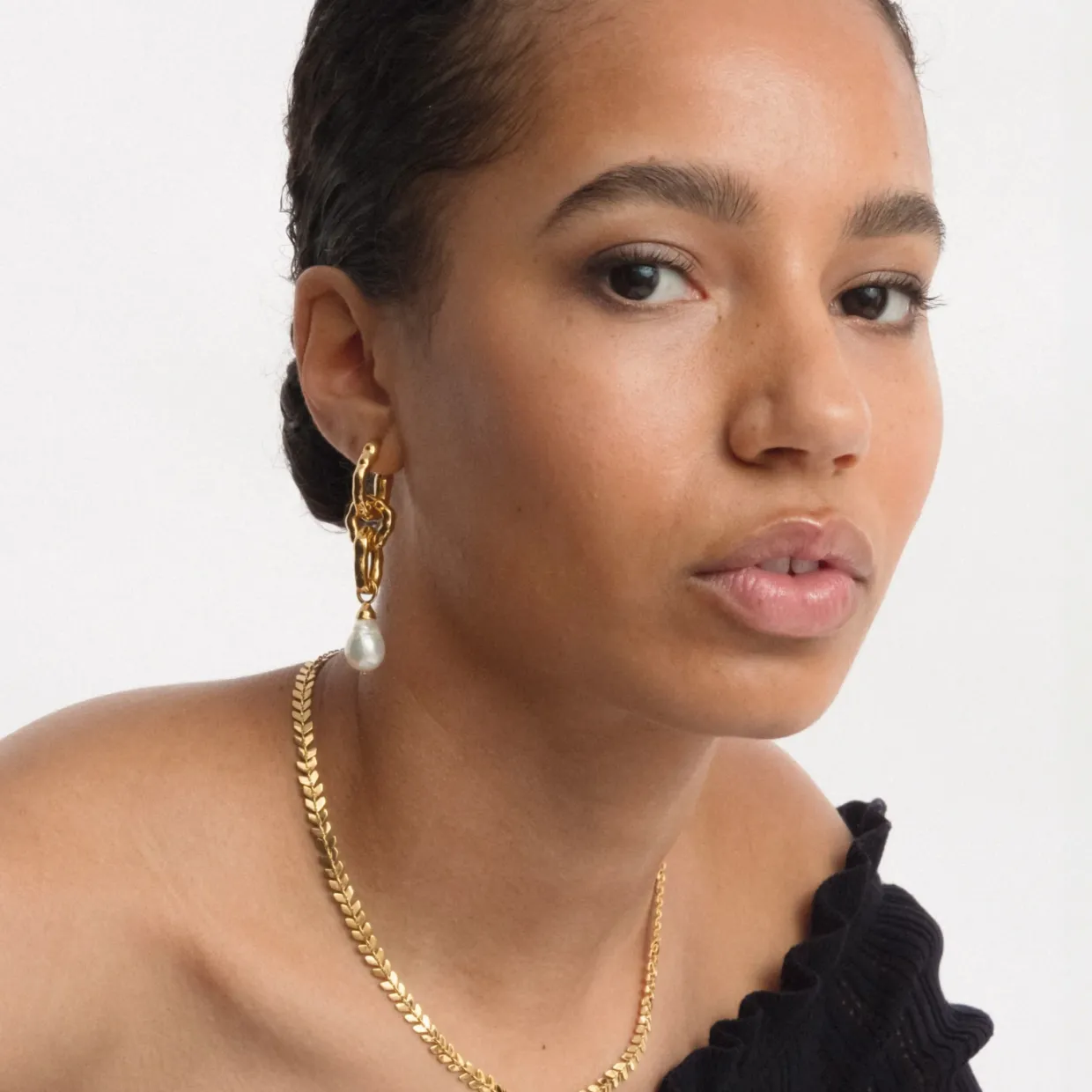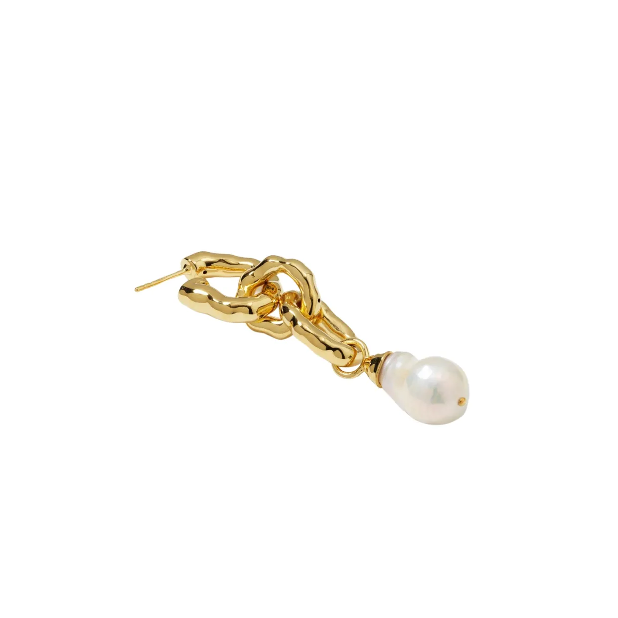 Långt örhänge av kraftiga länkar med hamrad finish och ett hänge med en barockpärla. Pärlan varierar i form, vilket verkligen gör varje smycke helt unikt. Tillverkat i 100% återvunnet sterlingsilver, pläterat med 18K guld. Från Syster P.