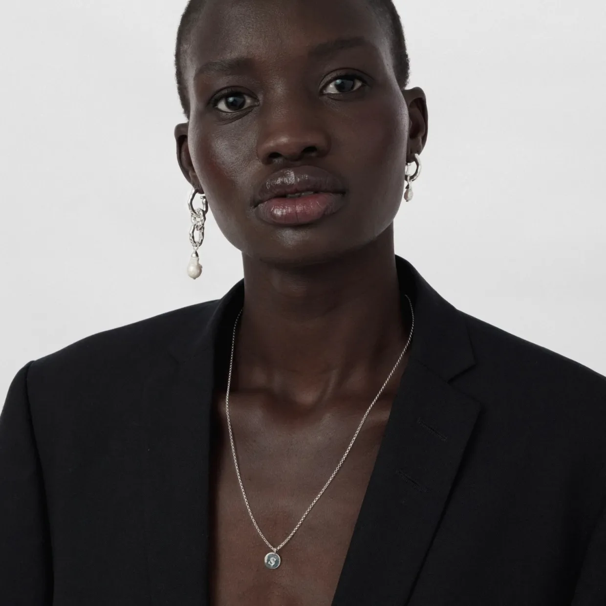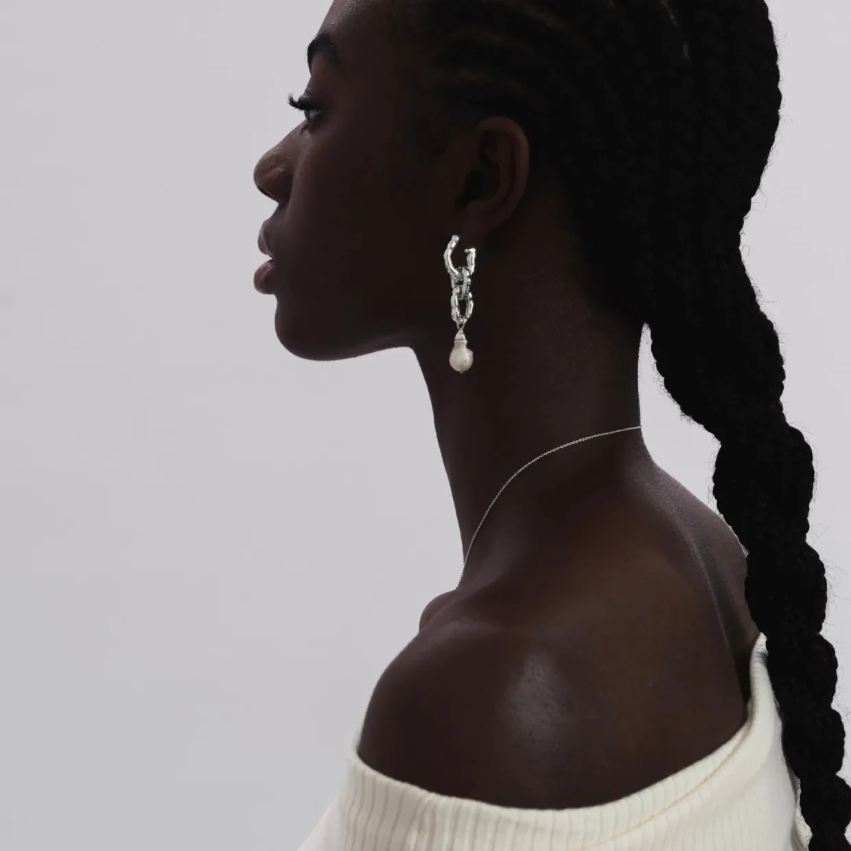 Långt örhänge av kraftiga länkar med hamrad finish och ett hänge med en barockpärla. Pärlan varierar i form, vilket verkligen gör varje smycke helt unikt. Tillverkat i 100% återvunnet sterlingsilver. Från Syster P.