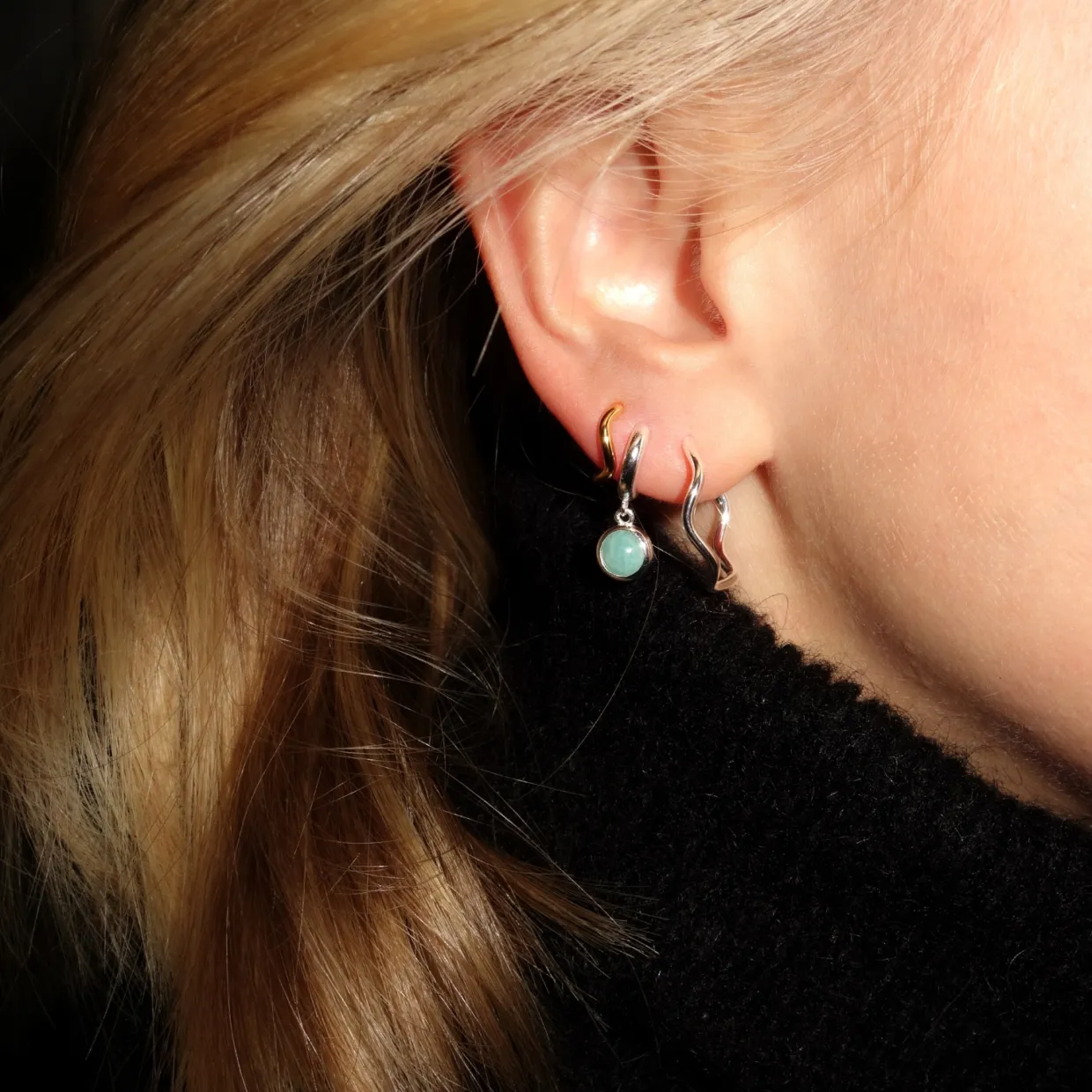 Smyckena är tillverkade i äkta silver, vilket ger dem en sofistikerad glans och hållbarhet. Den vackra stenen, en amazonit, är känd för sina lugnande färger som skiftar i olika nyanser av grönt och blått. Den mjuka, naturliga lystern hos amazoniten framhävs vackert mot den rena silverdesignen, vilket skapar en harmonisk balans mellan färg och form. Stenens storlek är 6 mm.