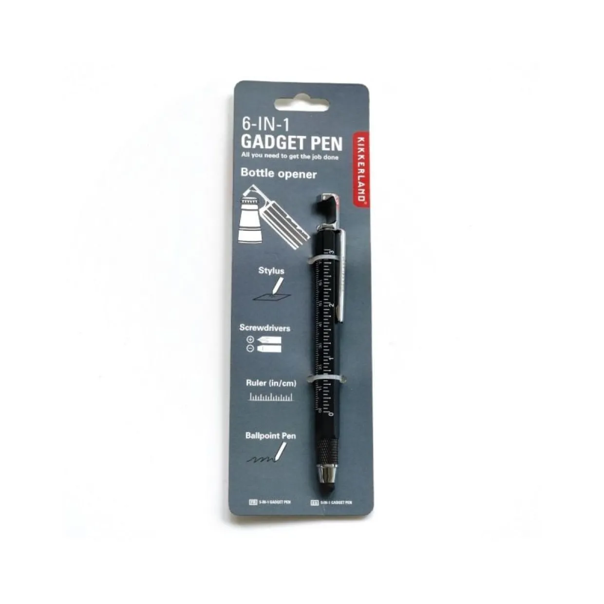 En mycket användbar verktygspenna med 7 praktiska funktioner: en flasköppnare, ett telefonställ, en linjal, en kulspetspenna, en touch-penna, en vanlig skruvmejsel och en stjärnskruvmejsel. Perfekt att ha i väskan!