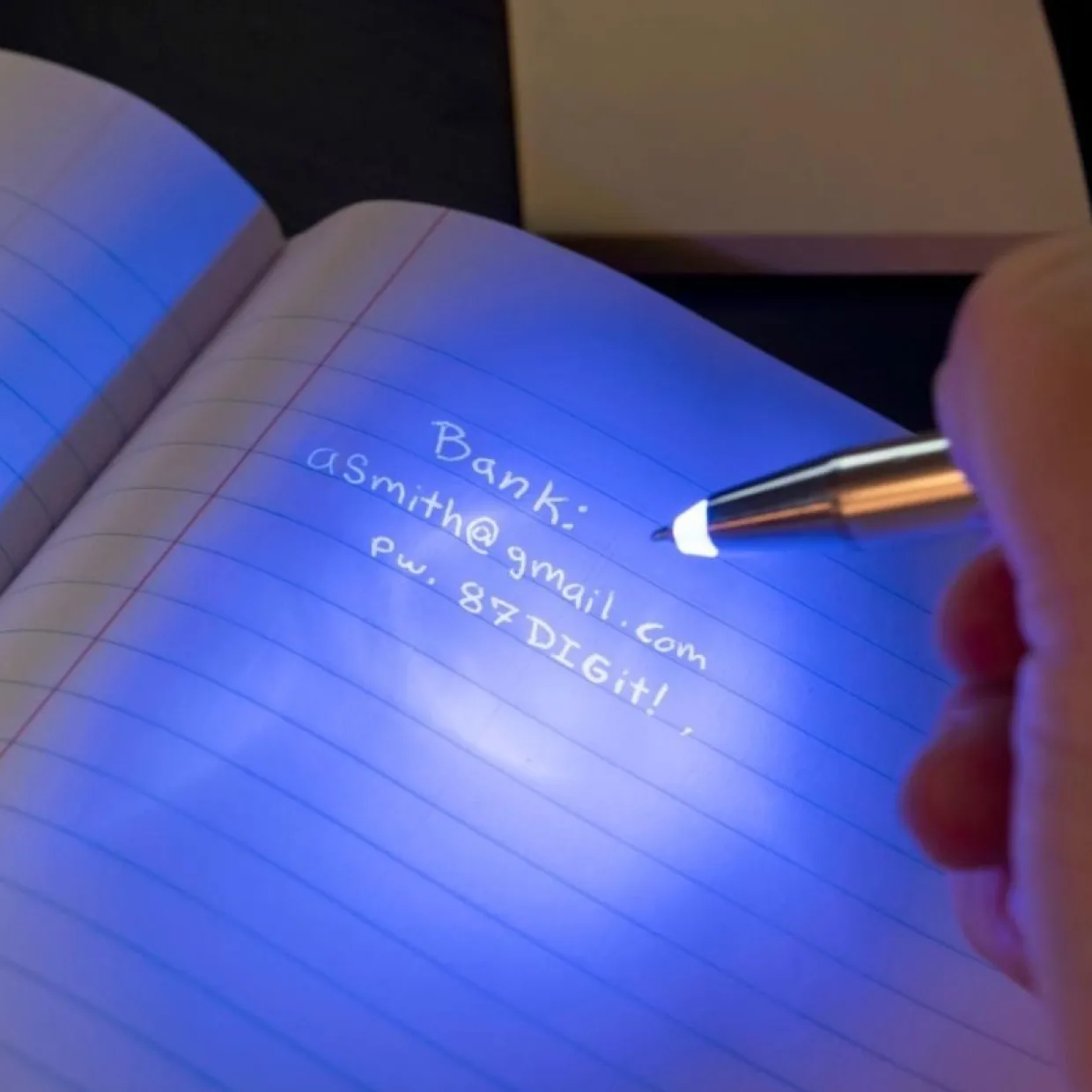 Osynlig bläckpenna för att skriva hemliga meddelanden eller lösenord. Skriv ner ditt hemliga meddelande, vänta några sekunder och lys sedan med pennans inyggda LED-ljus på meddelandet. Då kommer ditt hemliga meddelande att avslöjas och orden dyker upp.