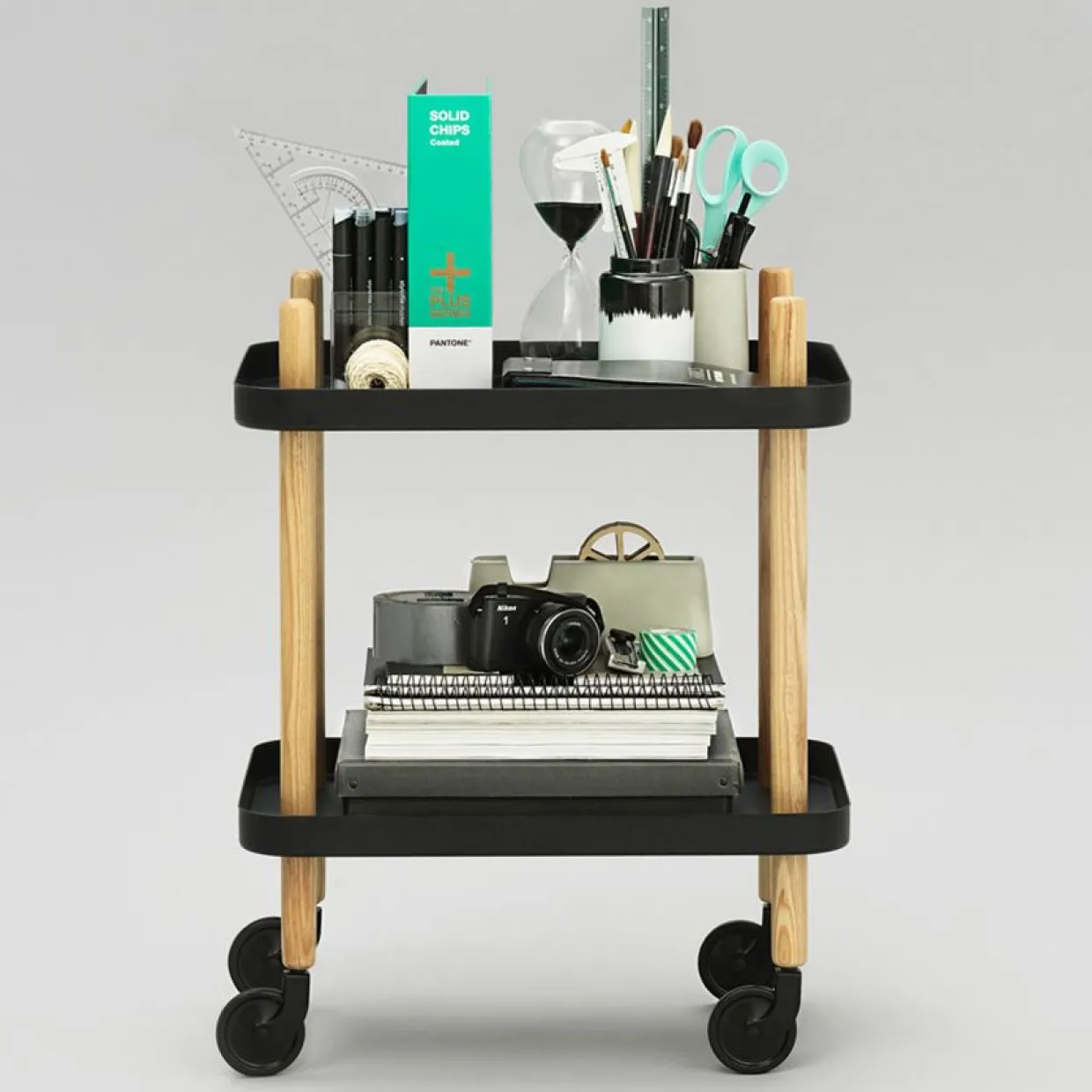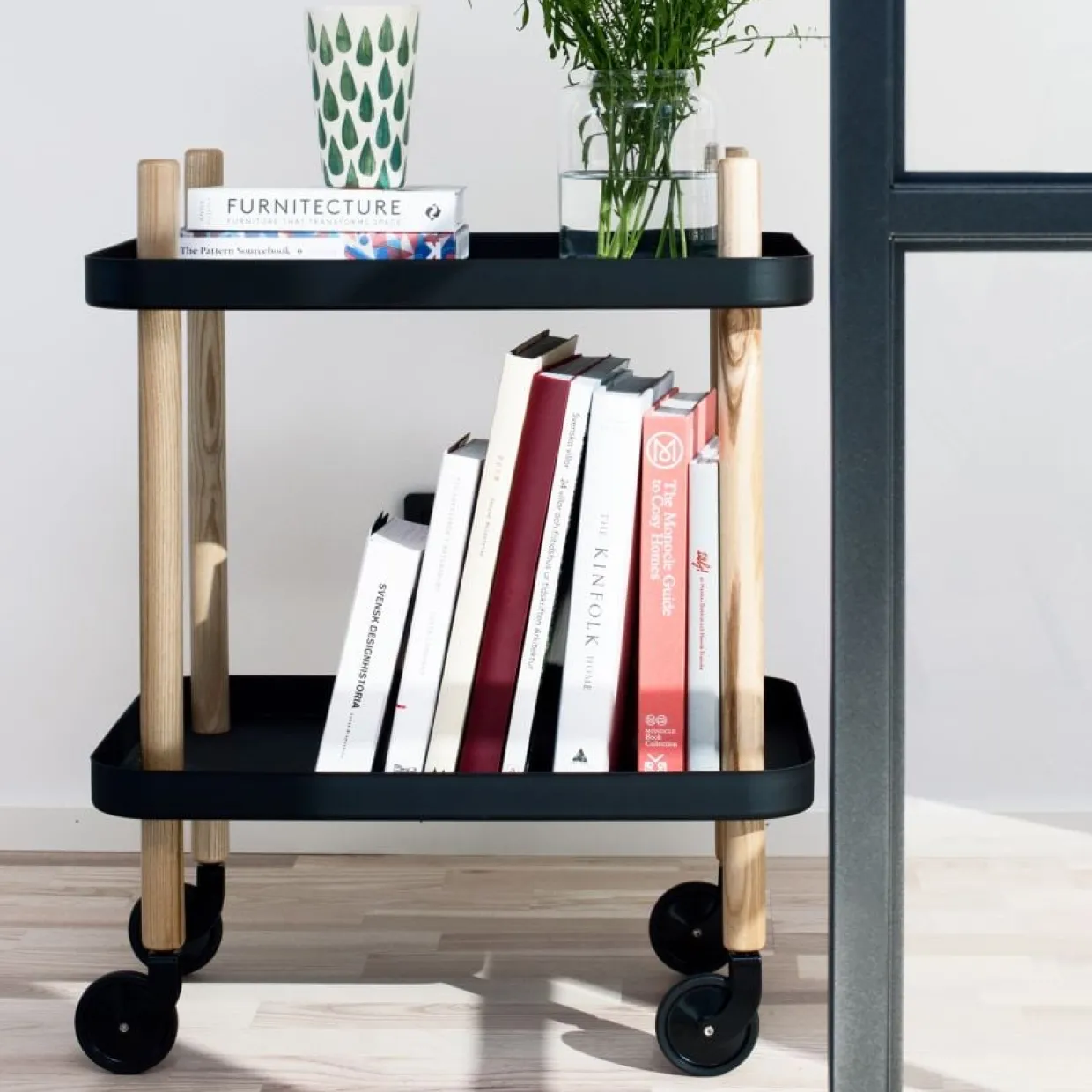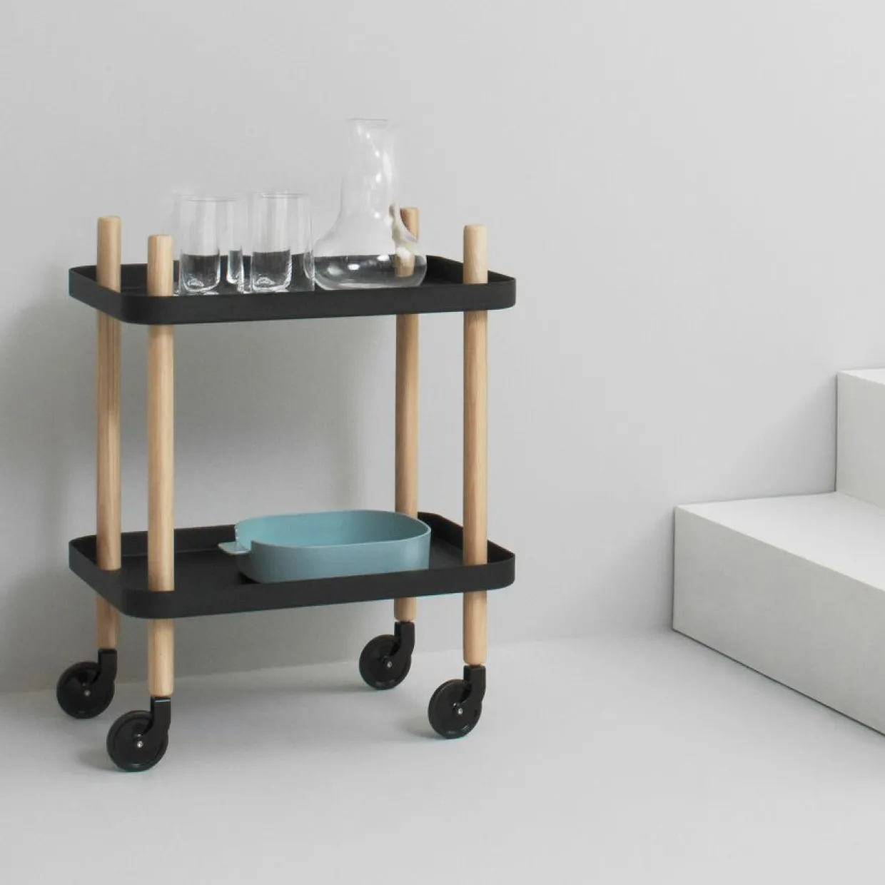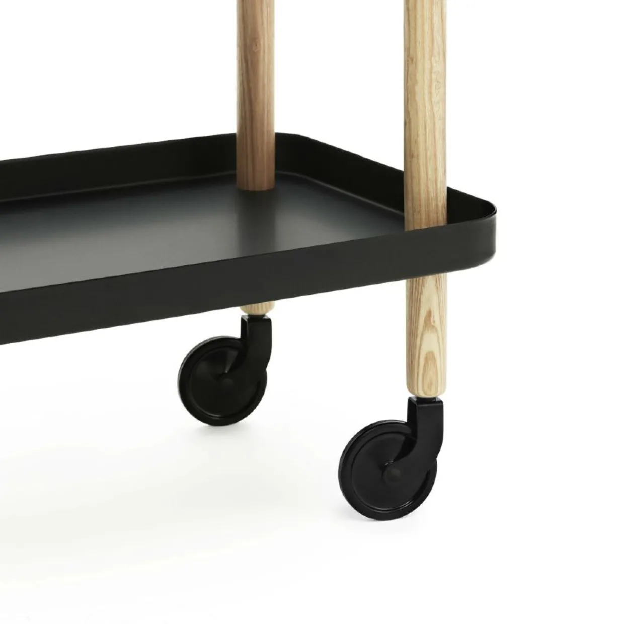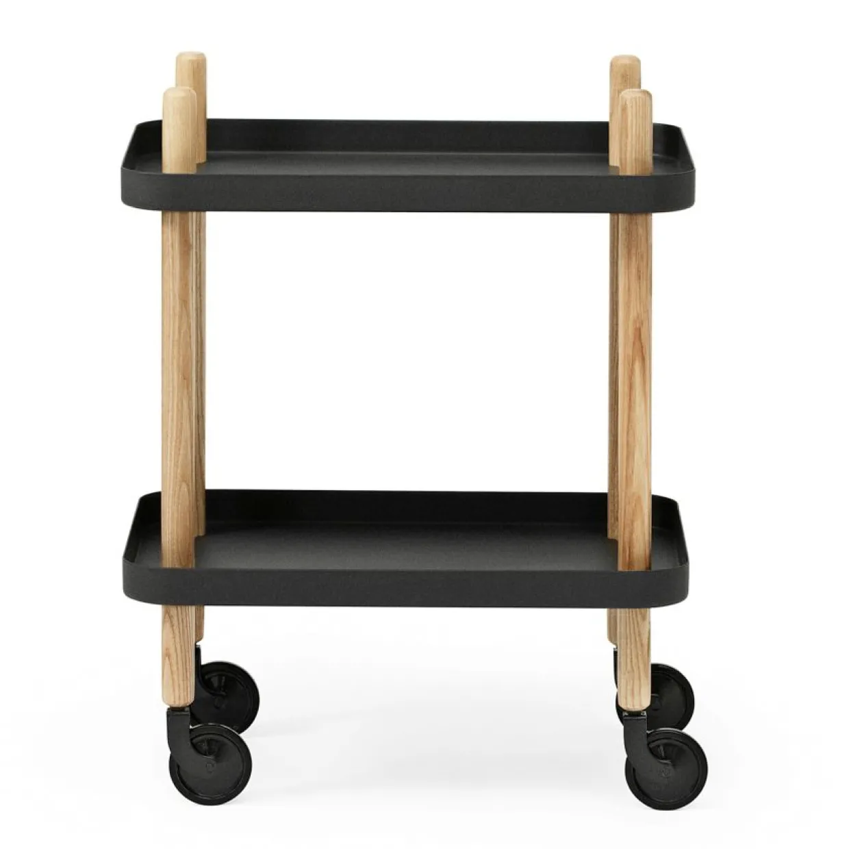 Stilren serveringsvagn från Normann Copenhagen, formgiven av Simon Legald. Passar perfekt som sidobord, tebord eller sängbord. Den har två rymliga hyllplan och hjul som kan rotera 360 grader för enkel förflyttning. Brickor av stål, ben i ask och hjul av stål och gummi.