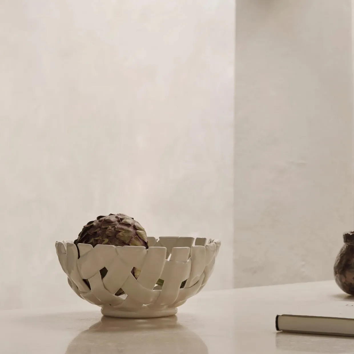 Plait skål Ø24 cm från ferm LIVING är ett handflätat keramiskt mästerverk inspirerat av traditionell korgflätning. Varje skål är noggrant formad för hand, vilket ger varje del en unik och medvetet ojämn karaktär. Perfekt för att visa upp färsk frukt eller bröd, erbjuder den både funktion och en konstnärlig touche till ditt hem.
