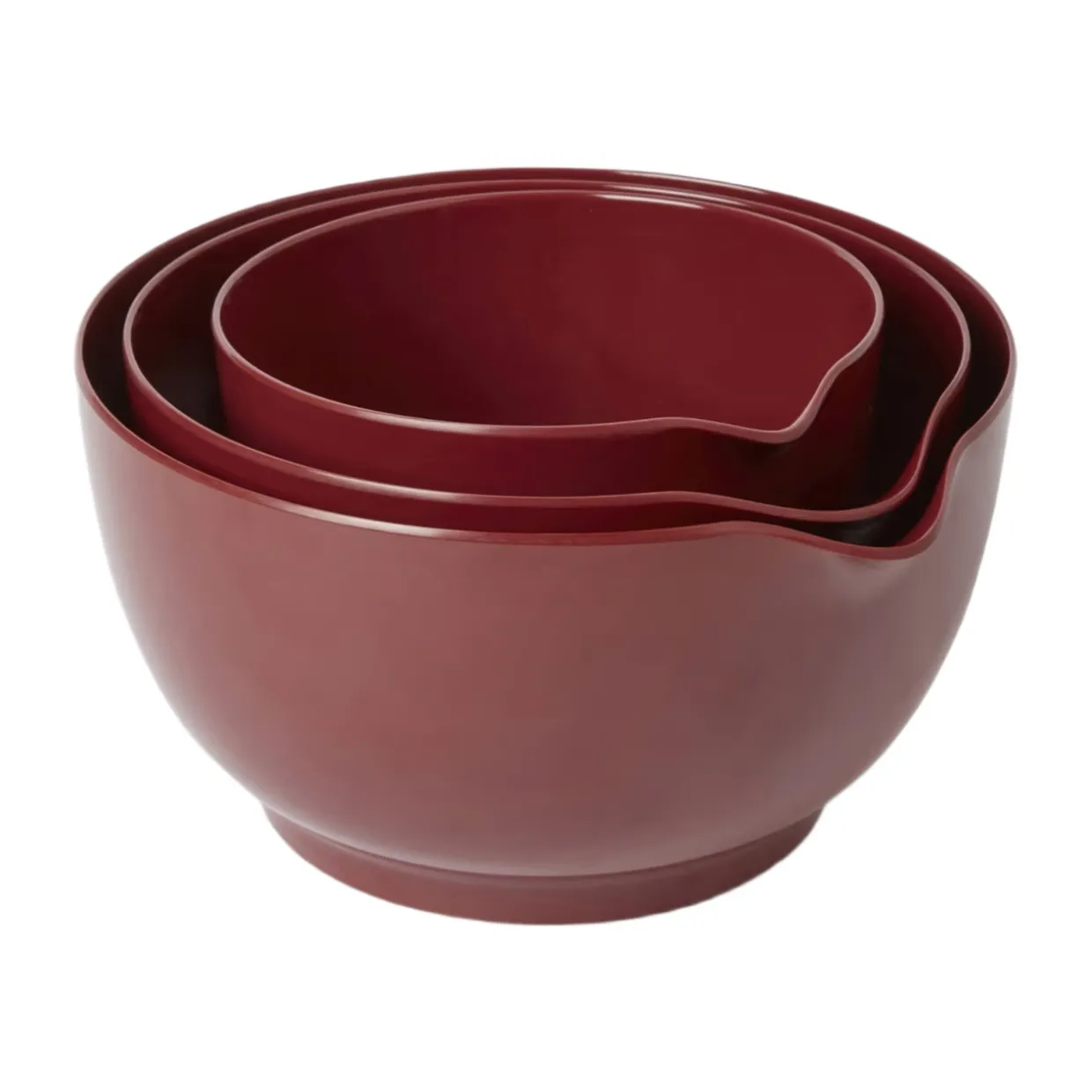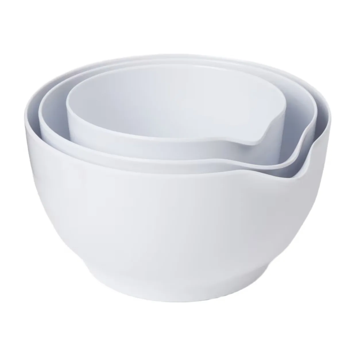 Set med tre klassiska bunkar av stöttåligt melamin, perfekt för vardagens alla köksbestyr. Bunkarna har en praktisk hällpip och en halkfri gummiring i botten som hållet skålen på plats.