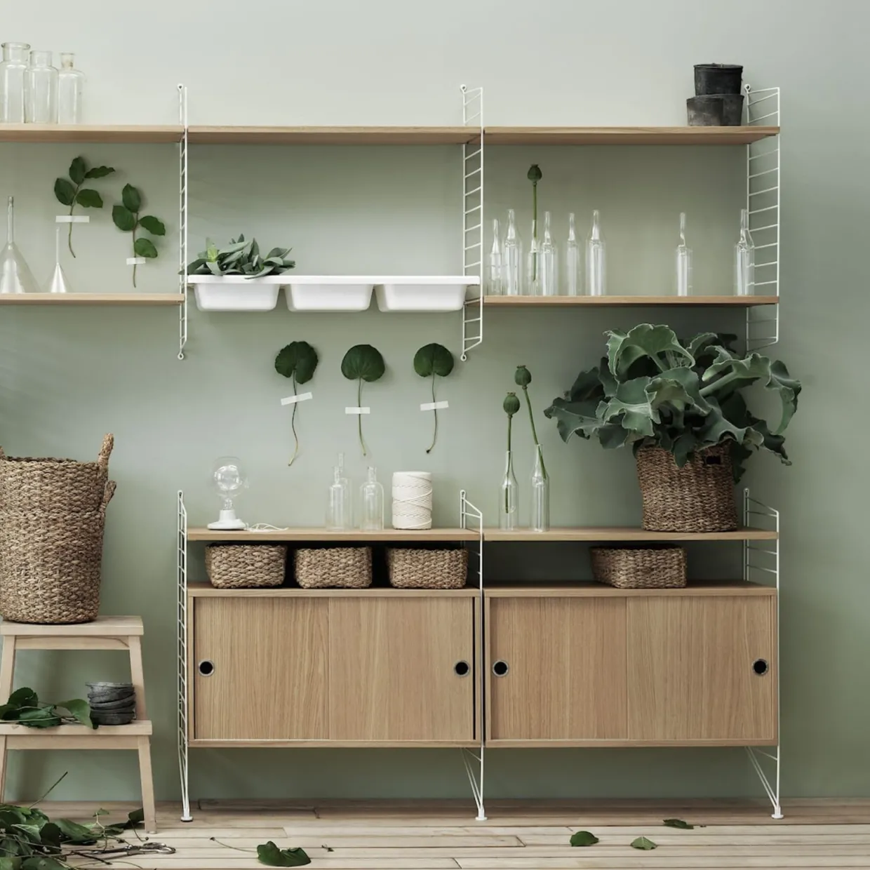 Skåpär är tillverkat i träfanér med skjutdörrar till din egen skräddarsydda Stringhylla. Insidans djup 16 cm. Handtag i rostfritt stål. Skåpet har två sektioner med varsitt löstagbart hyllplan. Upphängning ingår. Passar till vägggavlar med bredden 20 cm.