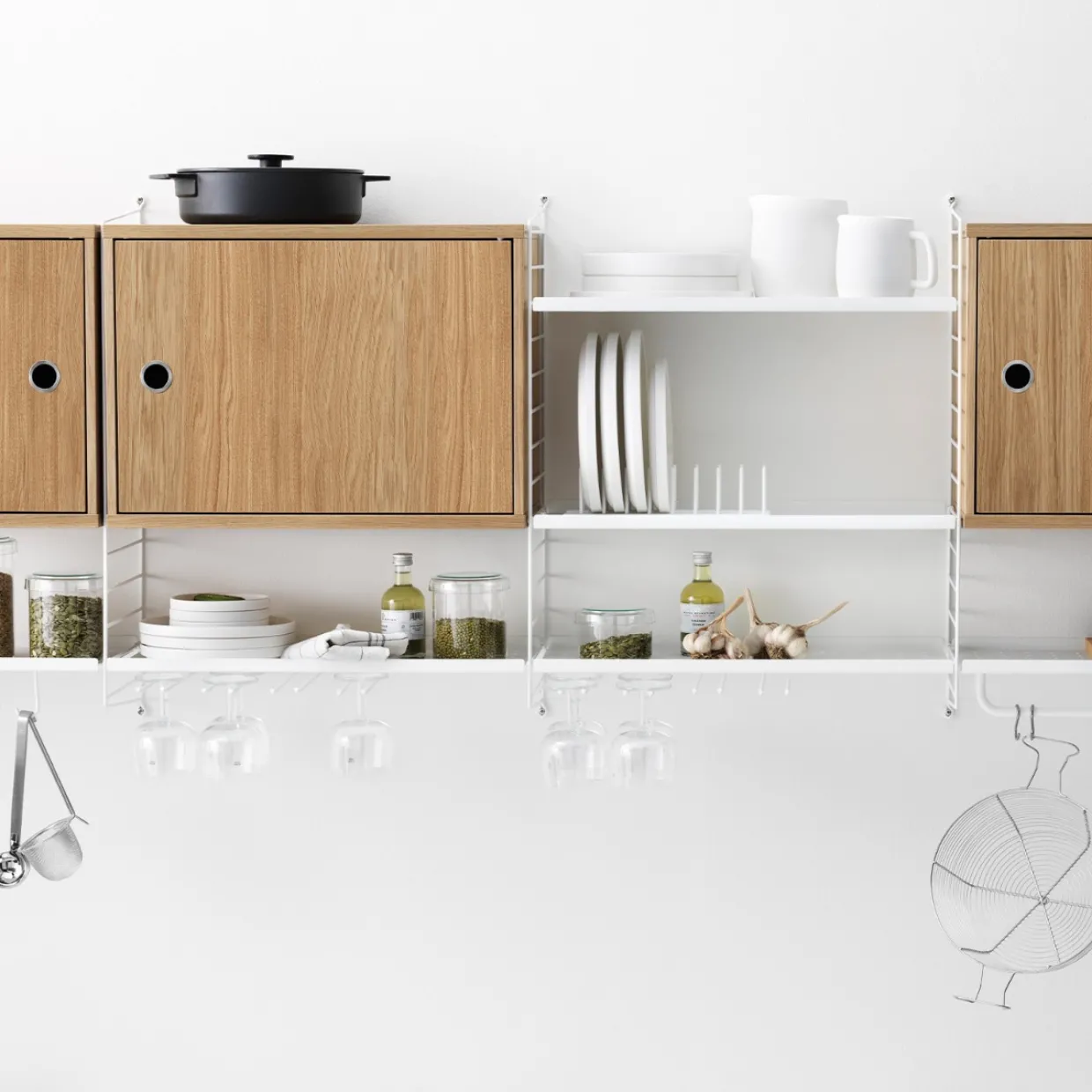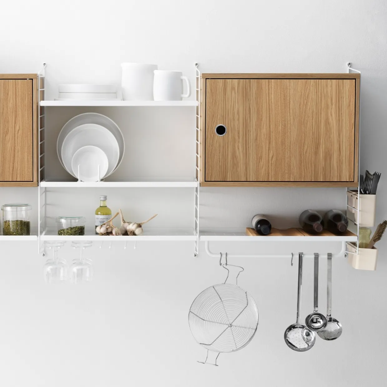 Skåp med dörr finns i en bredd, 58 cm, samt ett djup, 30 cm. Skåpet passar med tråd- och plexgavlar från String System förutsatt att gavlarna har 30 cm djup. Det är fint att bryta av din hylla med skåp som dessutom ger dig extra förvaring samt möjlighet att placera saker ovanpå. Skåpet består av ett innerhyllplan som kan justeras efter behov. Dörren är anpassningsbar och går att montera både på vänster och höger sida. Skåpet mäter invändigt: bredd 54 x djup 26 x höjd 38 cm. Levereras omonterat.