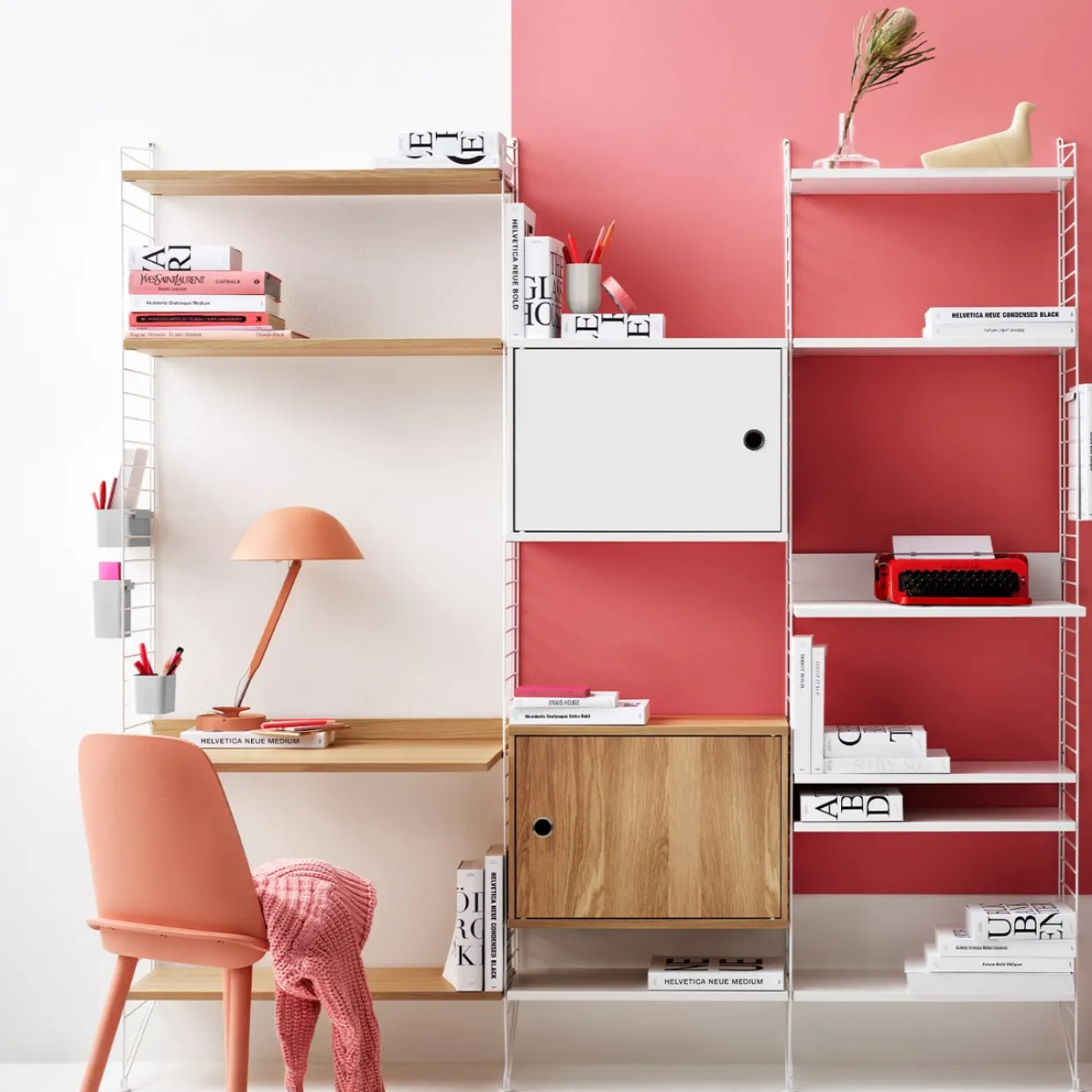 Skåp med dörr finns i en bredd, 58 cm, samt ett djup, 30 cm. Skåpet passar med tråd- och plexgavlar från String System förutsatt att gavlarna har 30 cm djup. Det är fint att bryta av din hylla med skåp som dessutom ger dig extra förvaring samt möjlighet att placera saker ovanpå. Skåpet består av ett innerhyllplan som kan justeras efter behov. Dörren är anpassningsbar och går att montera både på vänster och höger sida. Skåpet mäter invändigt: bredd 54 x djup 26 x höjd 38 cm. Levereras omonterat.