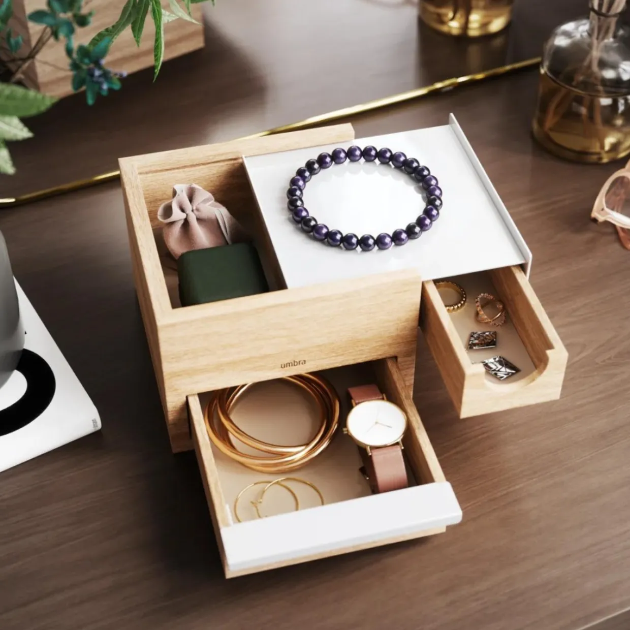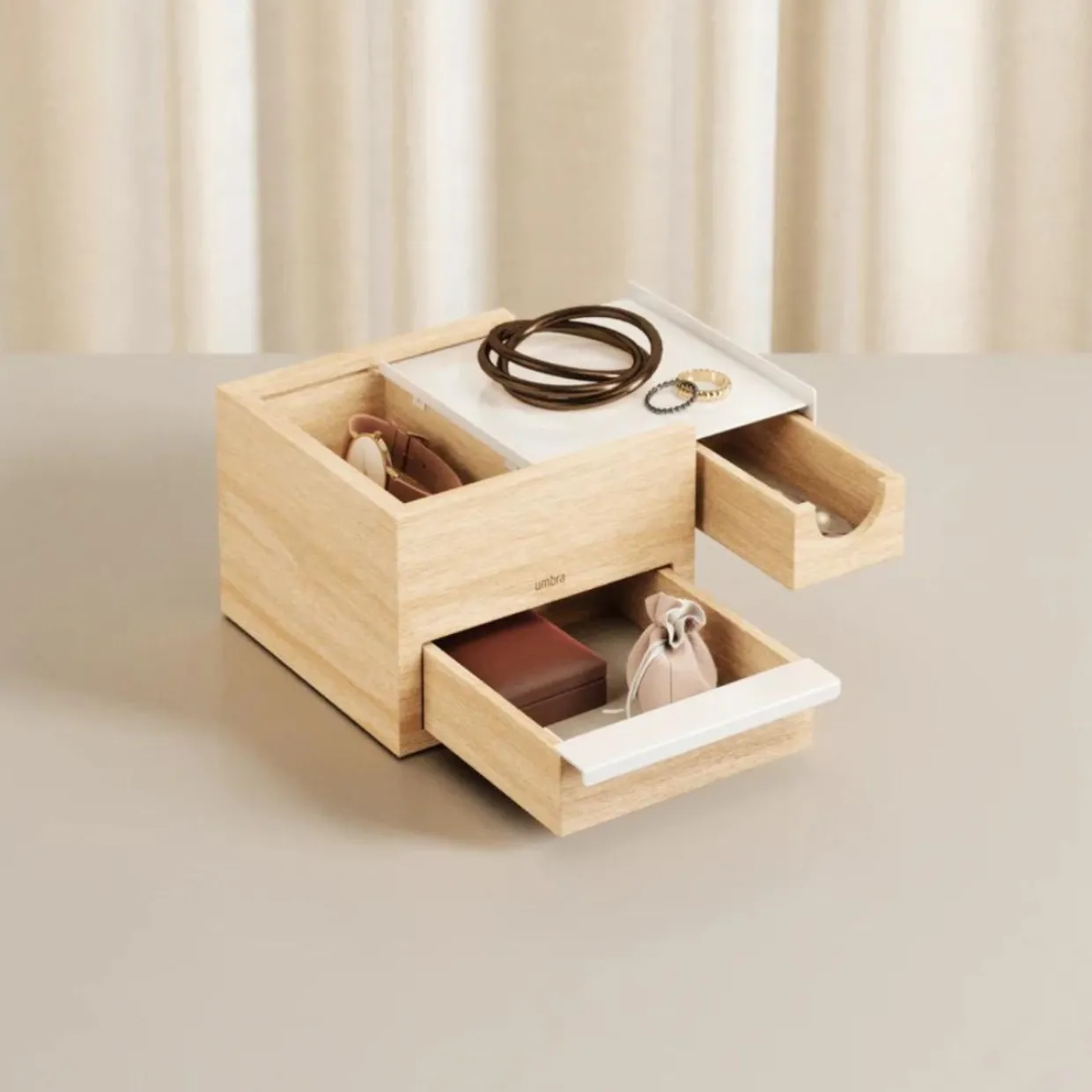 Det perfekta smyckeskrinet från UMBRA, för att hålla alla dina favoritsmycken på ett ställe, vilket gör dem lätta att komma åt. Flera dolda fack i olika storlekar gör att du kan förvara dina ringar, örhängen, armband, klockor, halsband och andra tillbehör i olika konfigurationer beroende på vad som passar dig bäst. Varje låda har en linnedyna för att förhindra att dina smycken flyttas runt eller skadas. Den enkla, moderna designen hos smyckeslådan är ett attraktivt tillskott till din byrå, nattduksbord, skrivbord eller var du än väljer att ställa den. Dessutom håller de skyddande gummifötterna den säkert på plats och säkerställer att vilken yta du än placerar den på inte kommer att repas av trä- och metalldesignen. Alternativt kan smyckesskrinet också användas som en minneslåda, för att förvara små värdesaker och andra prydnadssaker från dina äventyr, eller som en lådorganisator i ditt skrivbord eller nattduksbord. Mäter 15 x 17 x 11 cm. Kommer från förnybara träkällor och tillverkas med en miljövänligare finish. Den producerar 85 % mindre vatten och fast avfall än traditionella galvaniseringsfinisher. Trä är ett unikt naturmaterial med variationer i ton, textur och ådring kan förekomma.
