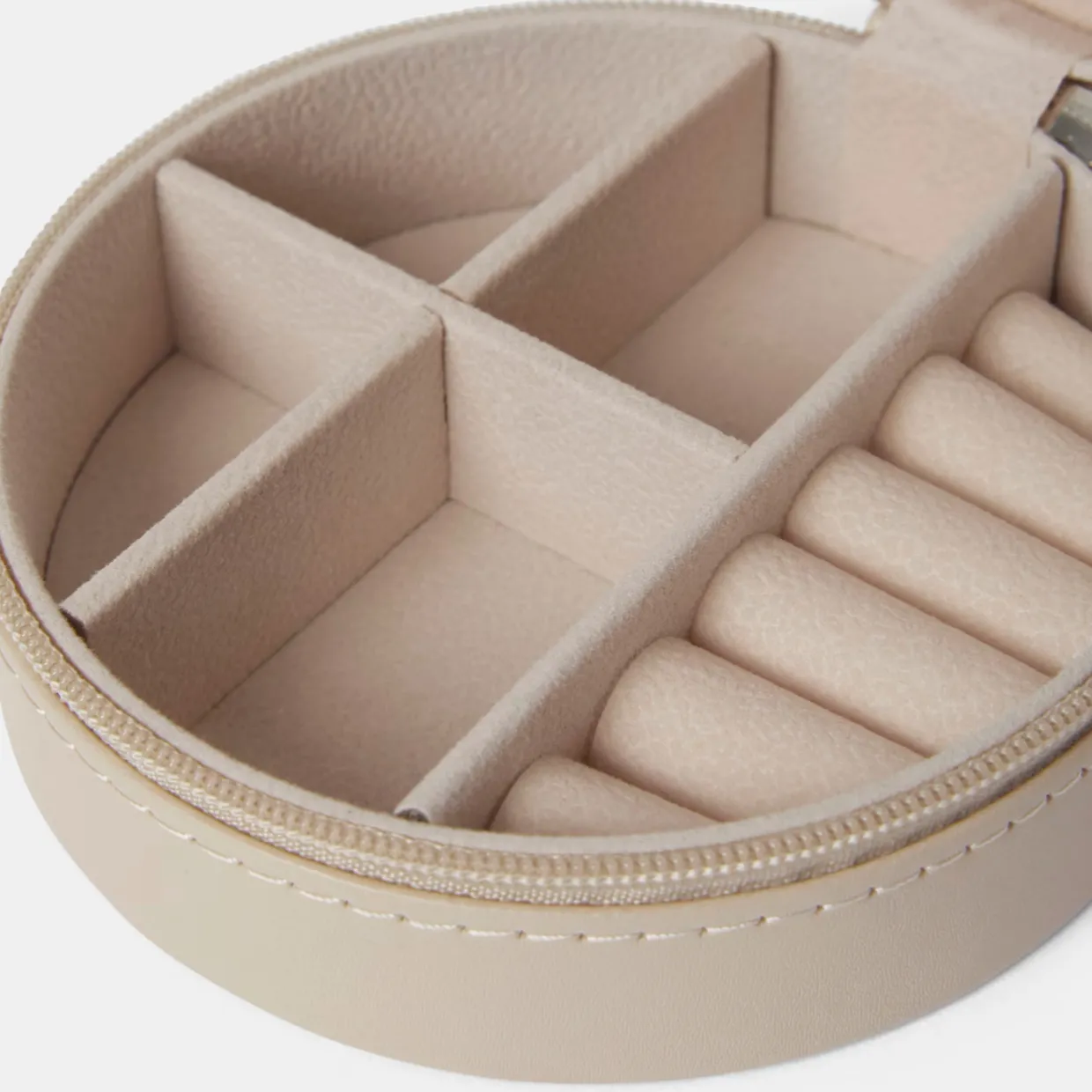 Litet runt smyckeskrin som är perfekt när du vill organisera bland favoritsmyckena hemma eller på resan. JACKIE stängs med en färgmatchad dragkedja och inuti skrinet finns gott om förvaringsmöjligheter för olika sorters smycken. Botten har fyra avskilda utrymmen och en vadderad rad för säker förvaring av ringar och örhängen. I locket finns tre krokar och en resårförsedd ficka nedtill för att enkelt hålla ordning på halsband.