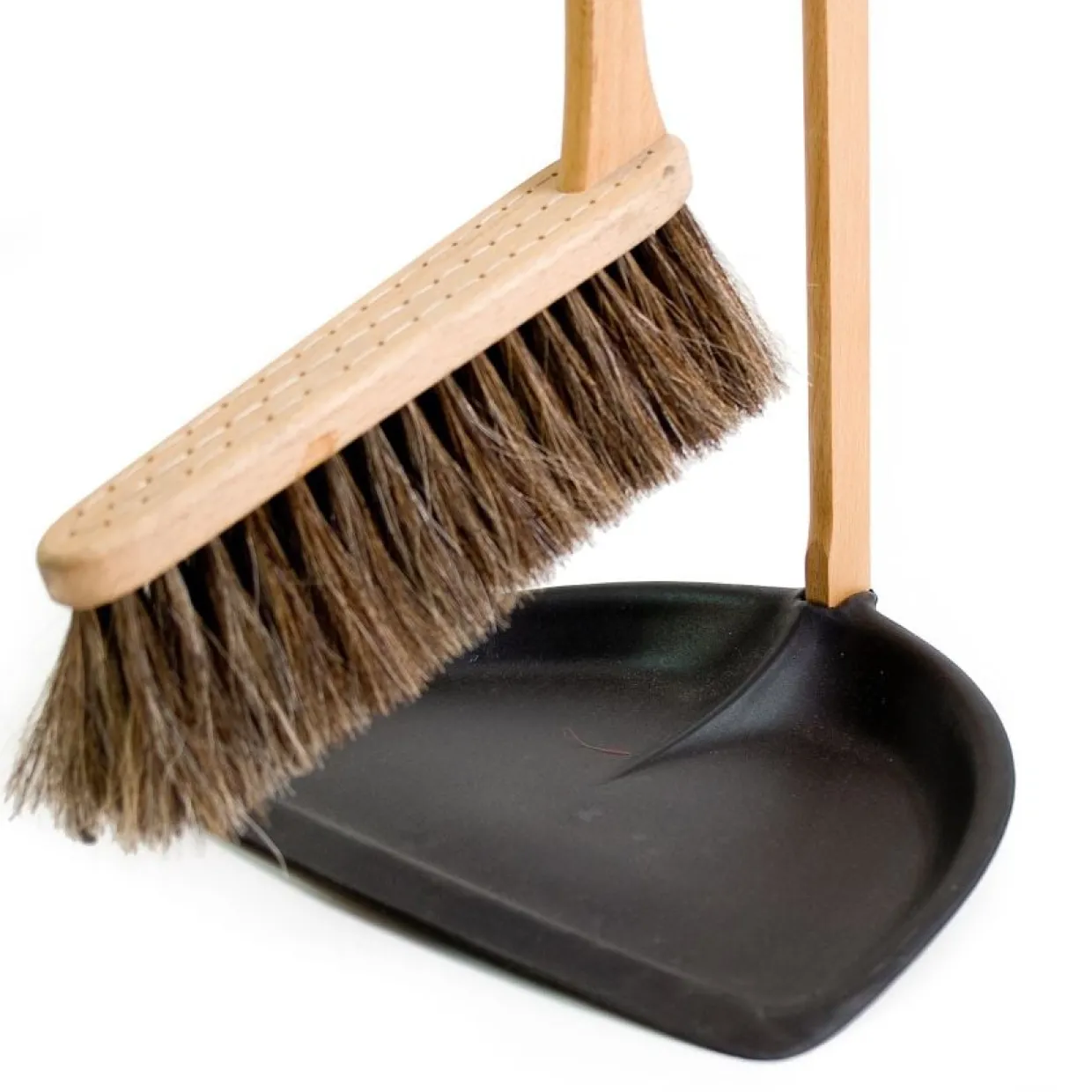 Bästa sättet att rengöra borsten är att med handen dra bort damm som samlats i borsten eller att använda en gammal hårborste för att kamma ur. Om borsten tappat formen så blöt upp den i lite ljummet vatten, krama ur och böj stråna rätt och låt sen torka hängande i sin klyka. Skyffeln rengörs med fuktig trasa.