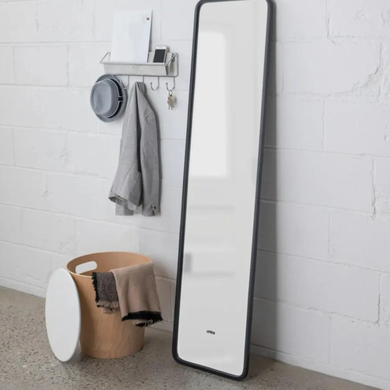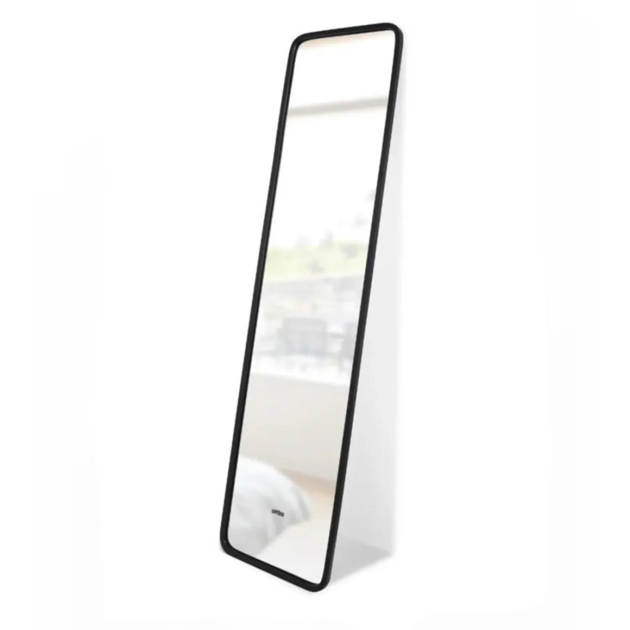 Denna helkroppsspegel kan monteras på eller lutas mot väggen för att passa ditt önskade utrymme. Dess gummiram ger en modern touch och fungerar som en stötdämpare vilket gör den hållbar och perfekt att placera i livliga områden i ditt hem. Designad för att vara smal och lätt, kan den stående spegeln också placeras i en rad små eller obekväma utrymmen och är enkel att flytta runt. Med sin stora och reflekterande yta hjälper denna spegel till att lysa upp ett rum och får ögat att tro att utrymmet är större. Mäter 157 x 37 x 5 cm) och monteringsbeslag ingår för väggmontering och anti-tip beslag ingår för lutning.
