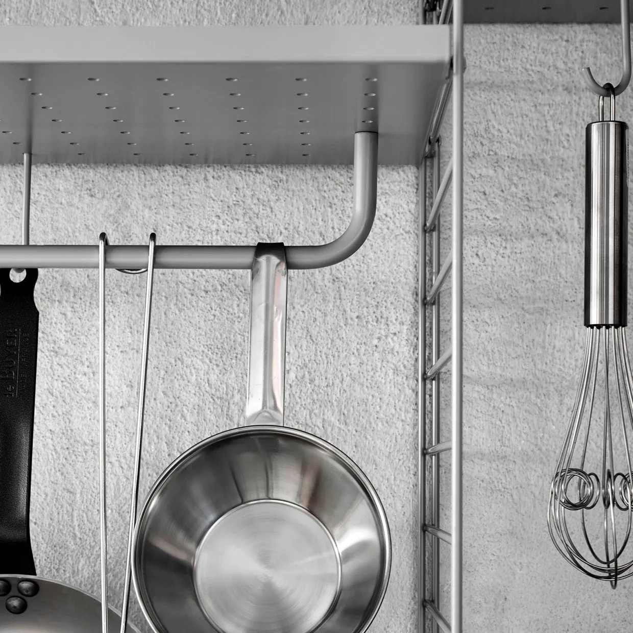 String stång i grålackad metall som passar till samtliga metallhyllplan från String. Perfekt till hallen.