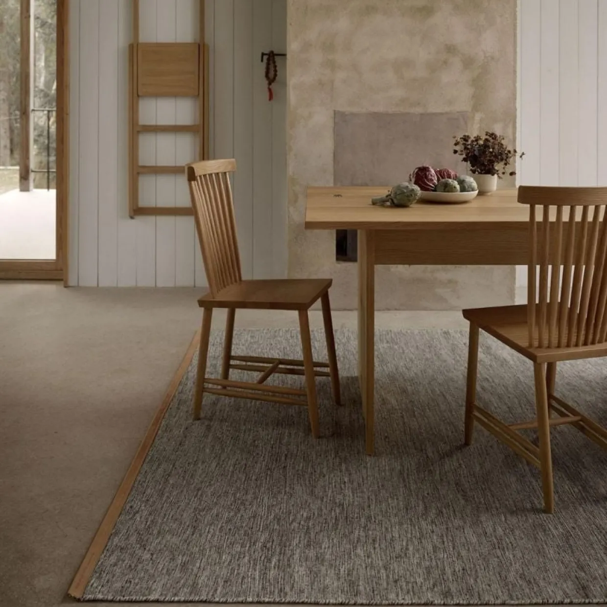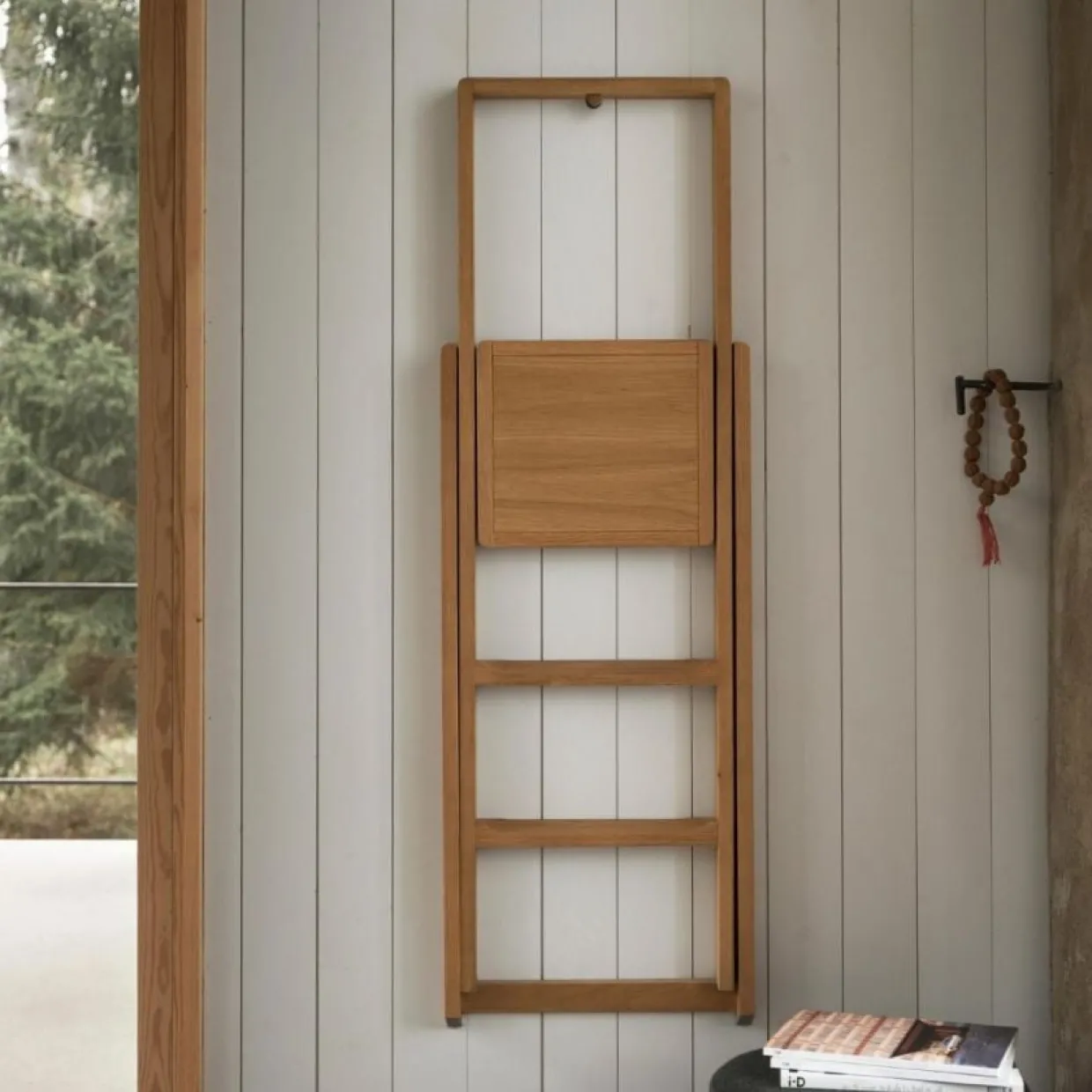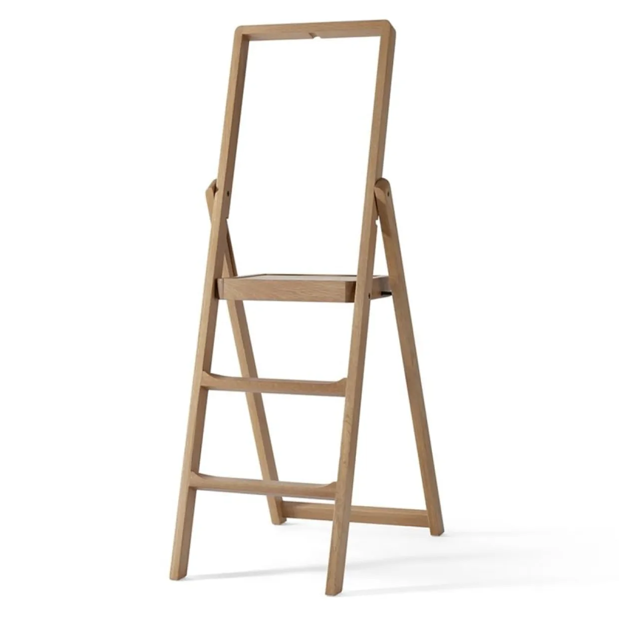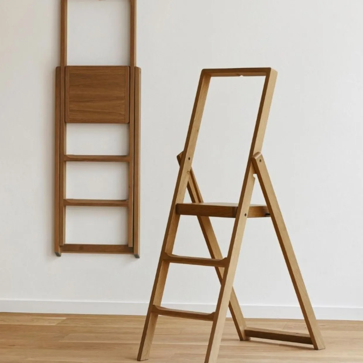 Step Stege av Karl Malmvall i massiv ek. Stegen är hopfällbar och kommer med en smart krok för upphängning på väggen. Praktisk att ha hemma och tillräckligt vacker för att inte gömmas undan när den inte används.