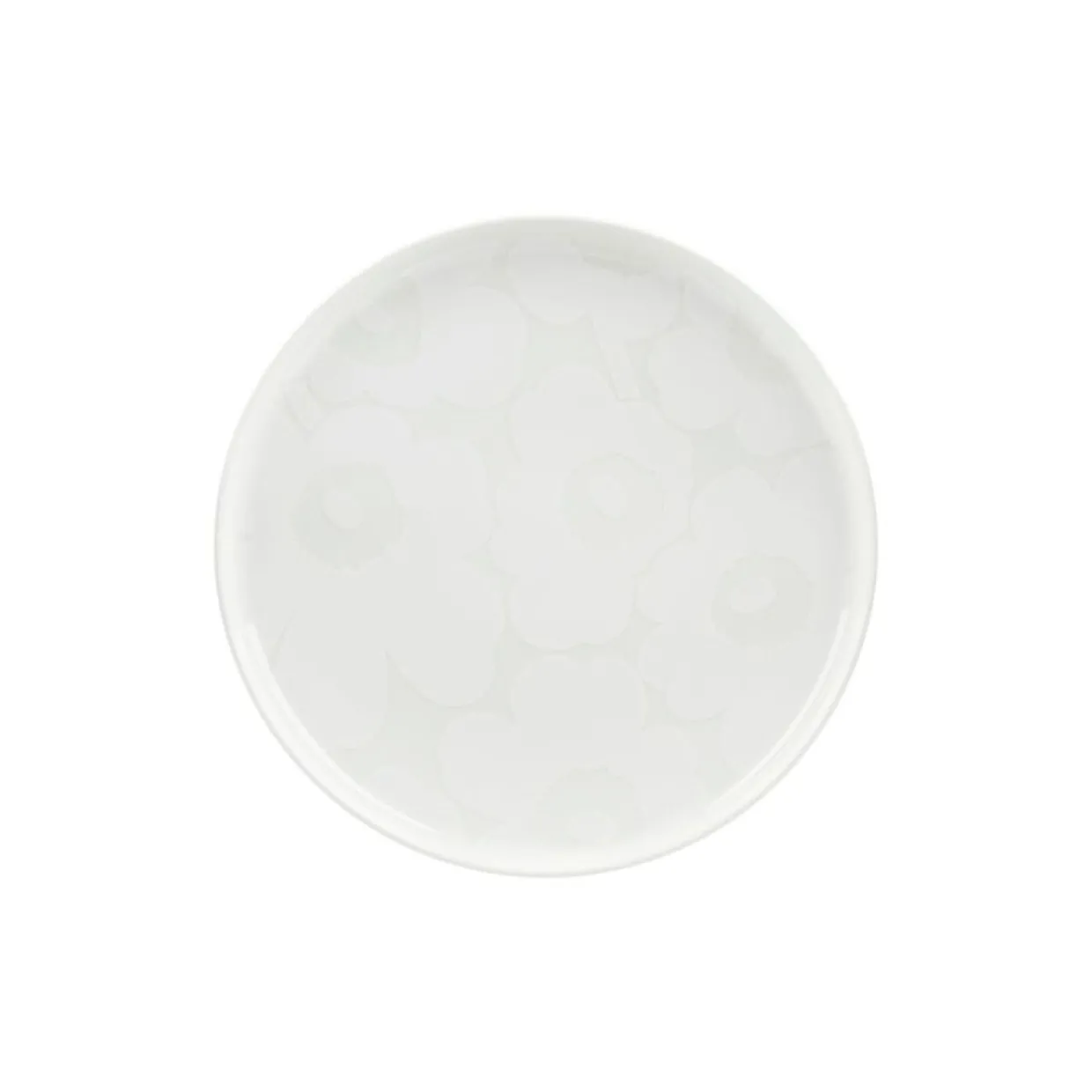 Tallriken Oiva/Unikko har ett subtilt mönster av vallmo (Unikko) som symboliserar kreativitet. Mönstret föddes i en tid då knappt några blommönster ingick i Marimekkos kollektioner. Maija Isola var dock fascinerad av temat blommor och bestämde sig för att skapa en hel rad nya blommönster. Tallriken är gjord av vitt stengods och tål diskmaskin, ugn, mikrovågsugn och frys. Ta bort klistermärket från produktens botten innan användning, det innehåller en liten mängd metall.