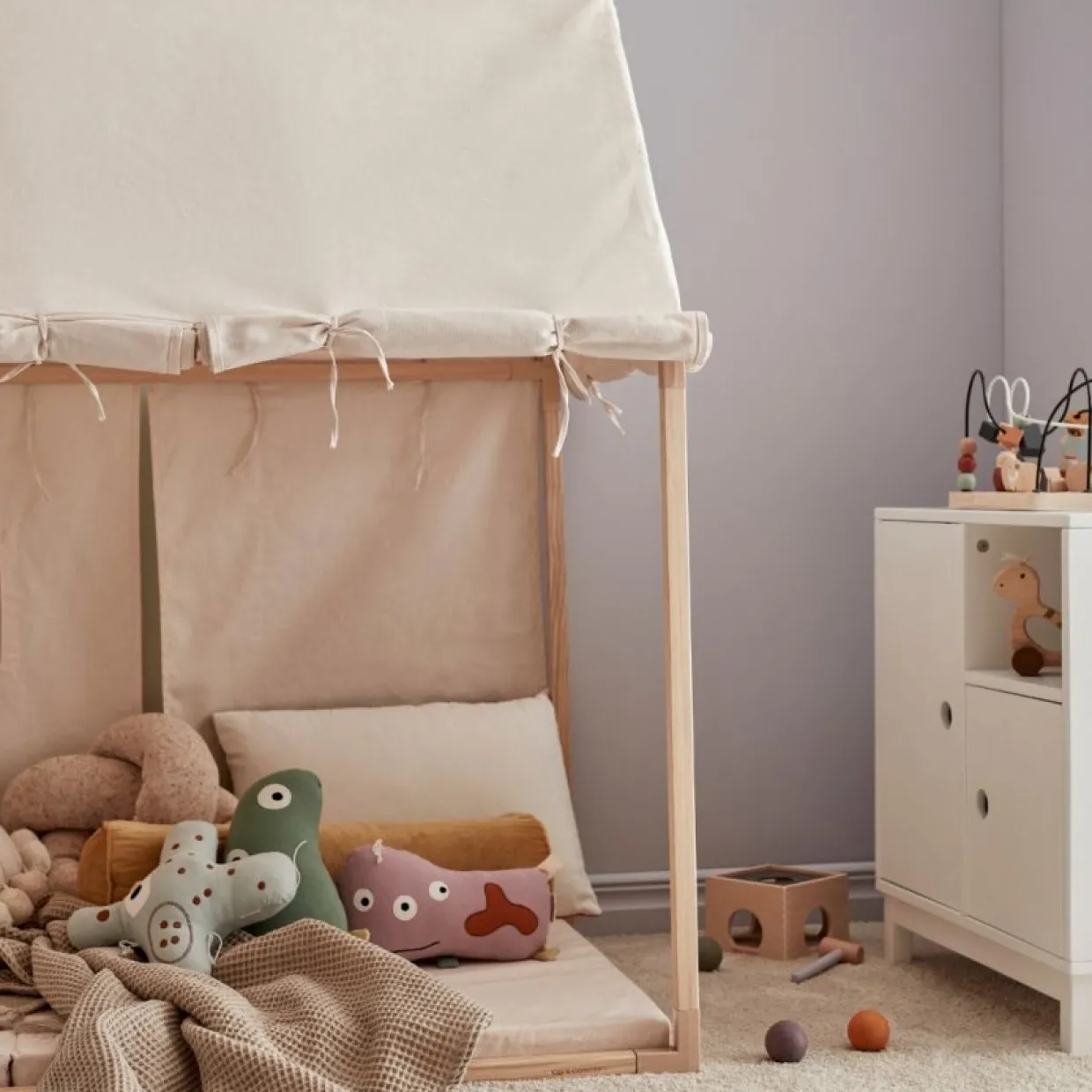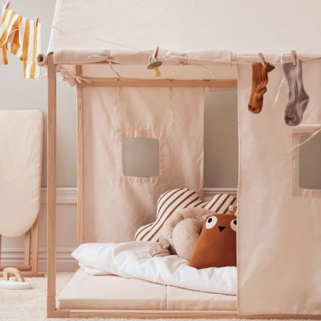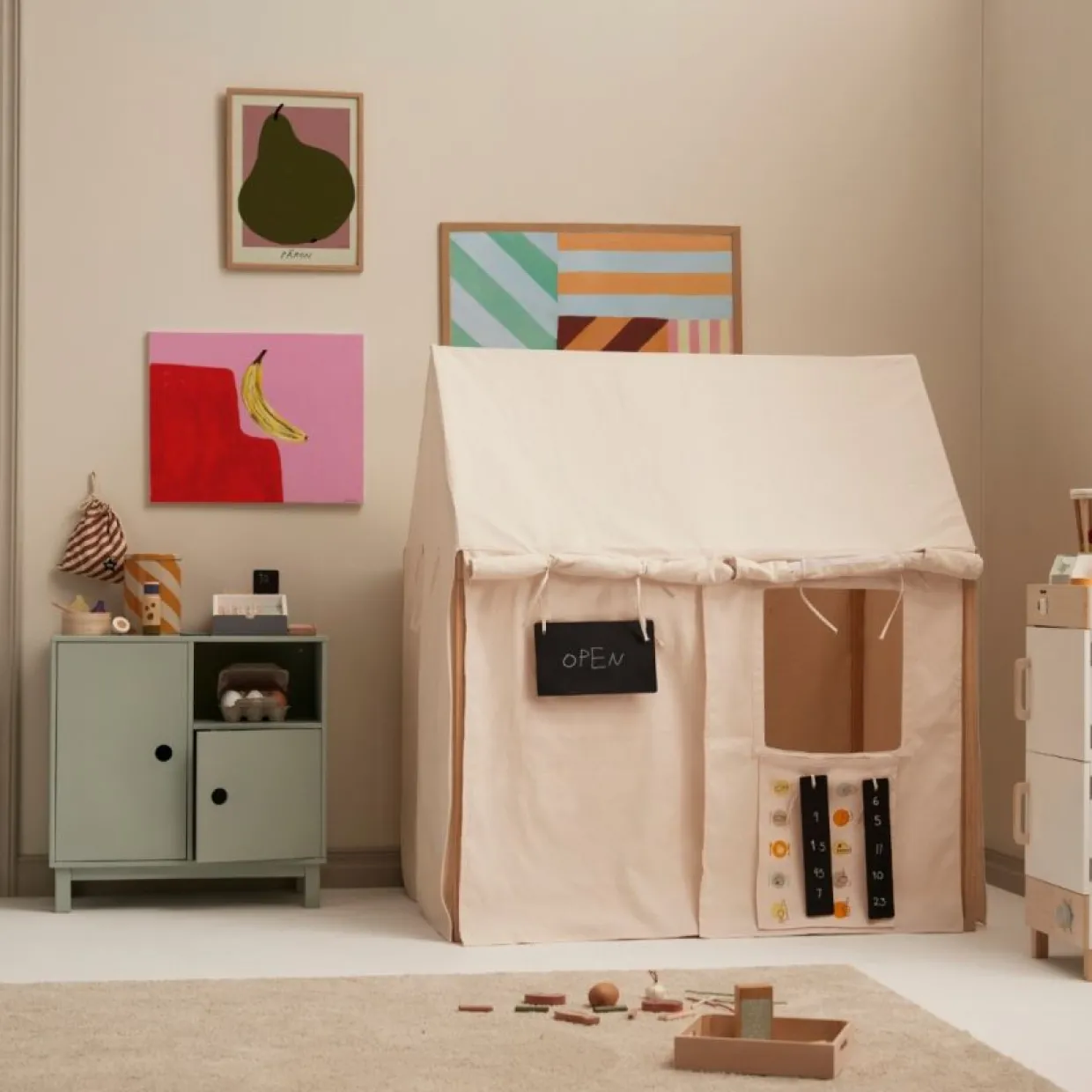 Det finns gott om plats för lek och bus i det här mysiga och populära lekhustältet. Alla sidor kan rullas upp och ner vilket gör att du kan anpassa lektältet helt efter var du placerar det. Rulla ihop sidorna på sommaren, och du kommer att ha en härlig plats att vila från solen. Eller rulla ner dem för att få en mysig koja. Lekhustältet är lätt att montera och ta ner vid behov. Ett jättebra lektält när barnen vill leka slott, restaurang, hus eller bara mysa. Det är bara fantasin som sätter gränserna här. Madrass/dyna medföljer ej.