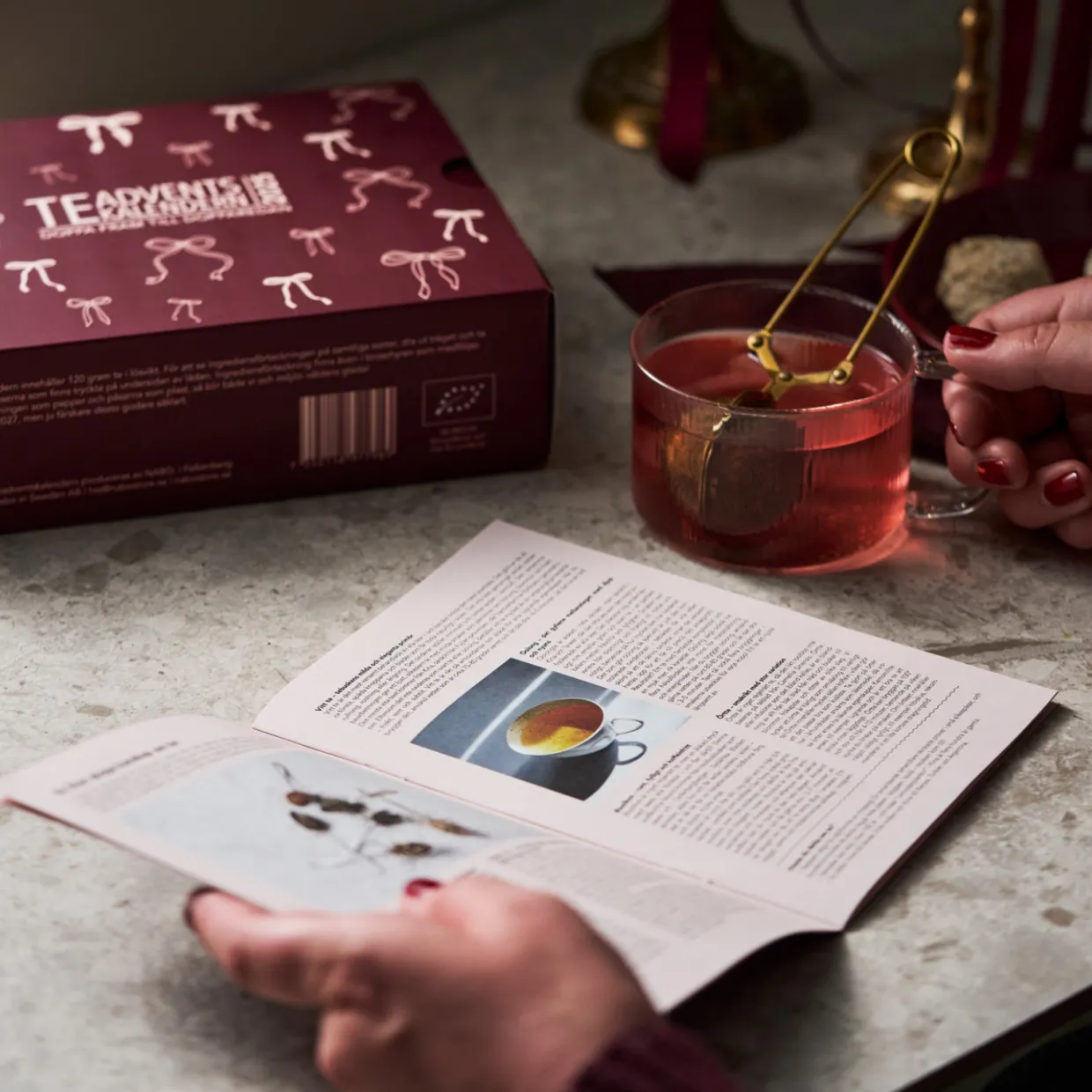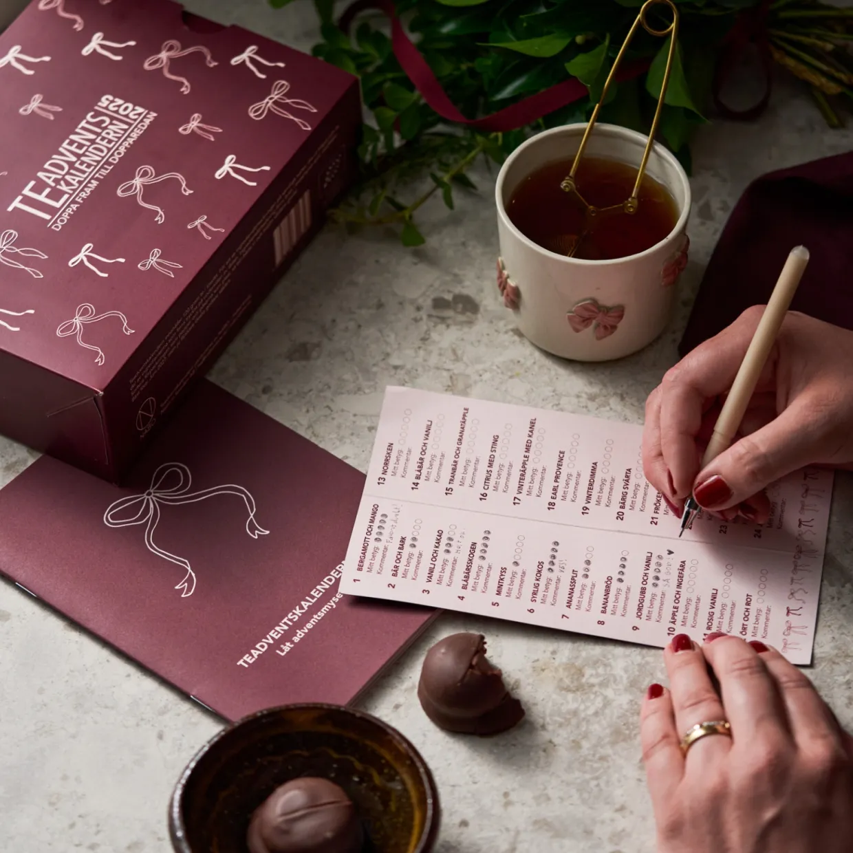 Teadventskalendern 2025 från Nabo! Teadventskalendern innehåller 24 olika sorters te i lösvikt. Nabos tekalender innehåller både svart, grönt och vitt te, samt rooibos och örtteer. Smakmässigt innehåller Teadventskalendern allt från rena teer, till kryddiga, mustiga, blommiga, friska och syrliga. Idéen till adventskalendern med te är en smakrik och lite mer vuxen adventskalender. För visst är det mysigt att även som vuxen räkna ner till julafton? Vi hoppas att tekalendern kan bidra med julkänsla, en smakupplevelse och en lugn och skön stund varje dag i advent.