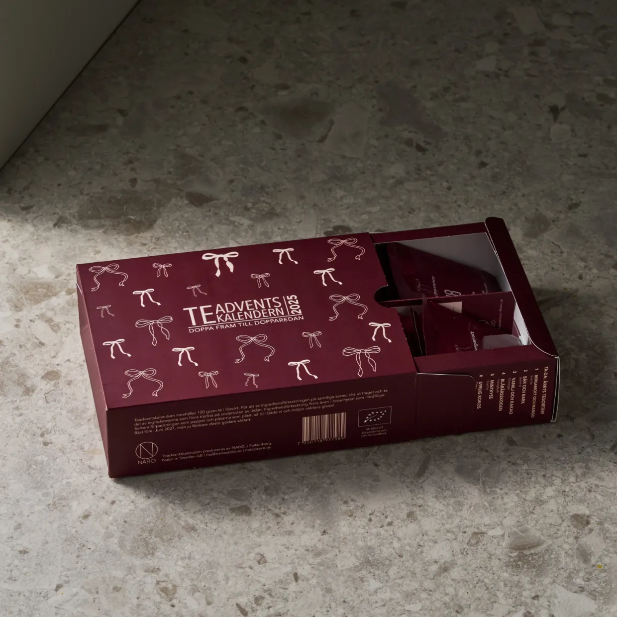 Alla teer i Teadventskalendern är ekologiska. Nabo är certifierade av Kiwa och eko-märkningen är SE-EKO-01.