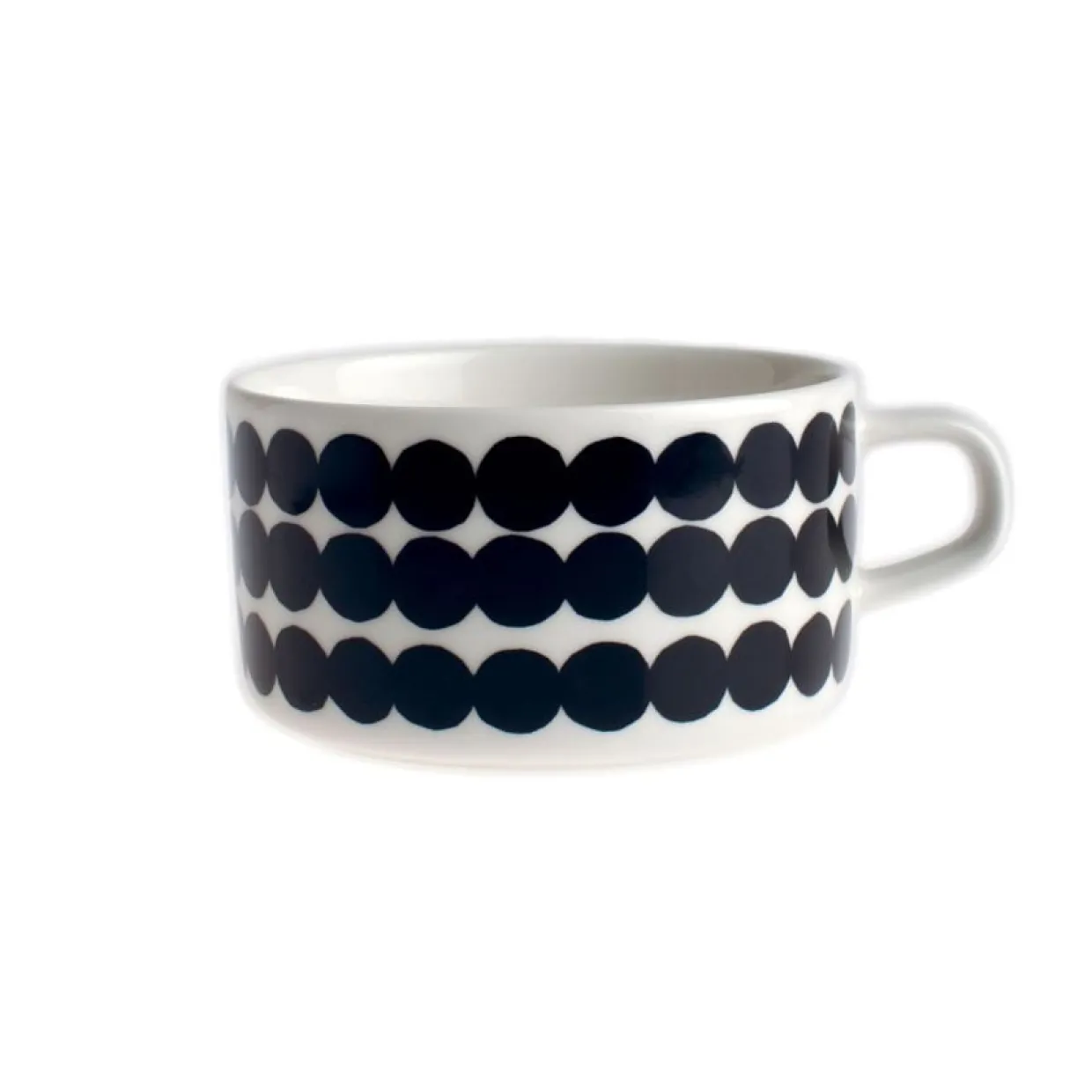 Tekoppen Räsymatto ingår i Marimekkos populära serie Siirtolapuutarha. Koppen är tillverkad i högkvalitativt stengods med ett lekfullt mönster i svart och vitt. Modellen på muggen är formgiven av Sami Ruotsalainen och mönstret är skapat av Maija Louekari. Räsymatto är det finska ordet för trasmatta, och det är tydligt att Louekari hittat inspirationen till mönstret från just sådana.