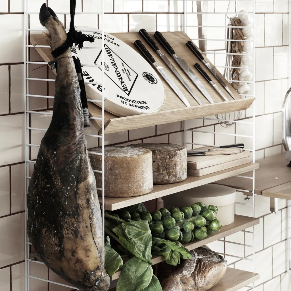 Tidsskriftshyllorna i trä finns i två bredder, 58 cm och 78 cm, och passar med 30 cm djupa trådgavlar från String® System. Tidsskrifthyllorna skapar karaktär och ger dig möjlighet att visa din favoritbok eller bryta av din bokhylla med en plats för tidningar och magasin. Välj bland olika färger och träslag som passar just din stringhylla. Det medföljer upphängningsbeslag i förpackningen